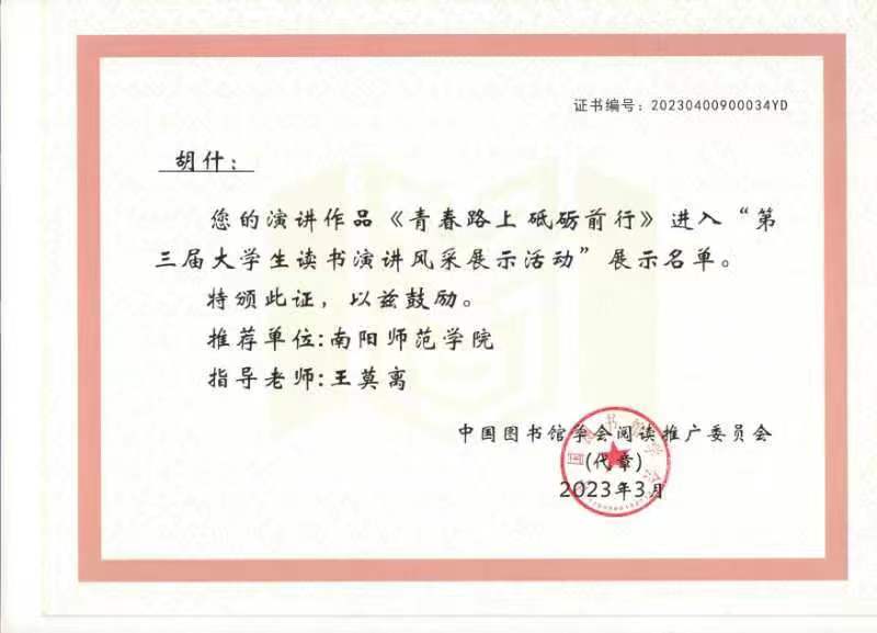 本网讯(通讯员 王莫离)近日,在中国图书馆学会主办的第三届全国大学生读书演讲风采展示活动中,天游官网参赛选手胡什、李佳璐过关斩将,入选展示名单,图书馆王莫离老师荣获优秀指导老师奖。