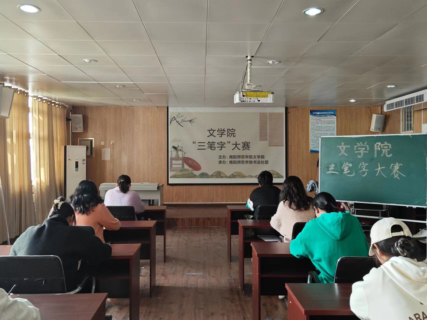 3月29日,书法社团在中区逸夫楼s307、s308室进行“三笔字大赛”。比赛分粉笔字和硬笔字两个会场。粉笔字比赛现场,社员们笔法流畅,或方正、或圆润、或清秀、或苍劲。硬笔字比赛现场,社员们凝神聚气,一笔一划、一撇一捺间,一幅幅作品跃然纸上。