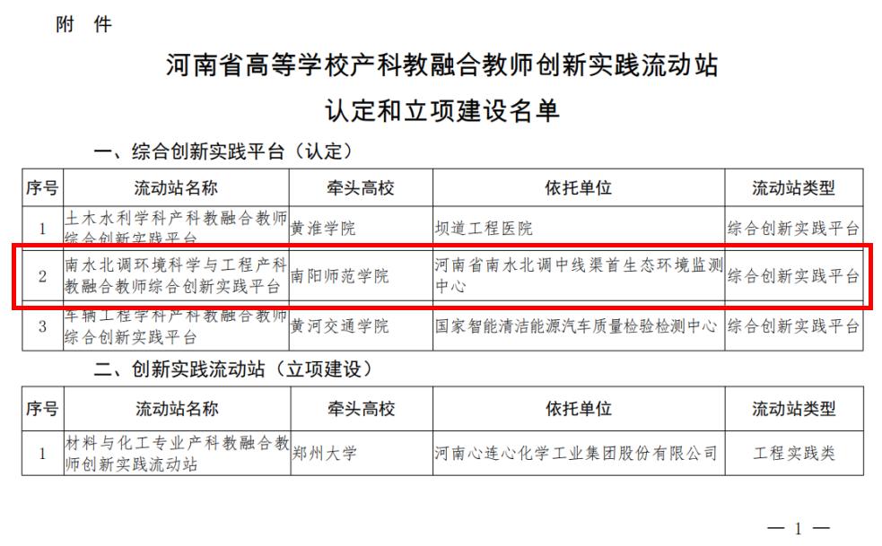 本网讯(通讯员 张君 杜志豪)近日,河南省教育厅正式发文,由天游ty8线路1线路2检测中心李玉英教授为负责人,河南省南水北调中线渠首生态环境监测中心为依托单位,联合郑州大学、河南工程学院、华北水利水电大学、河南理工大学、河南师范大学、河南大学、河南城建学院、中原工学院8家高校共同申报的河南省本科高校产科教融合教师创新实践流动站“南水北调环境科学与工程产科教融合教师综合创新实践平台”获批综合创新实践平台。
