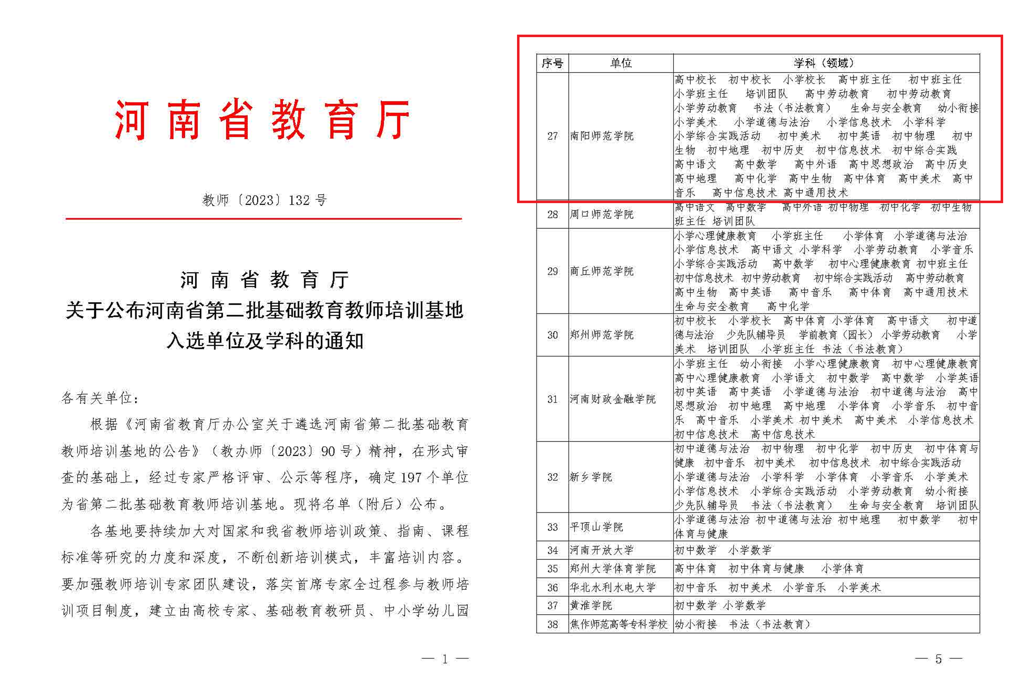 本网讯(通讯员 王中国)4月25日,河南省教育厅发布《关于公布河南省第二批基础教育教师培训基地入选单位及学科的通知》(教师〔2023〕132号),天游官网“高中校长”“初中校长”“高中班主任”等39个学科(领域)成功获批。至此,在2022年首批成功入选的15个学科(领域)基础上,天游官网已有54个学科(领域)入选河南省基础教育教师培训基地,实现了基础教育教师培训服务全学段覆盖。
