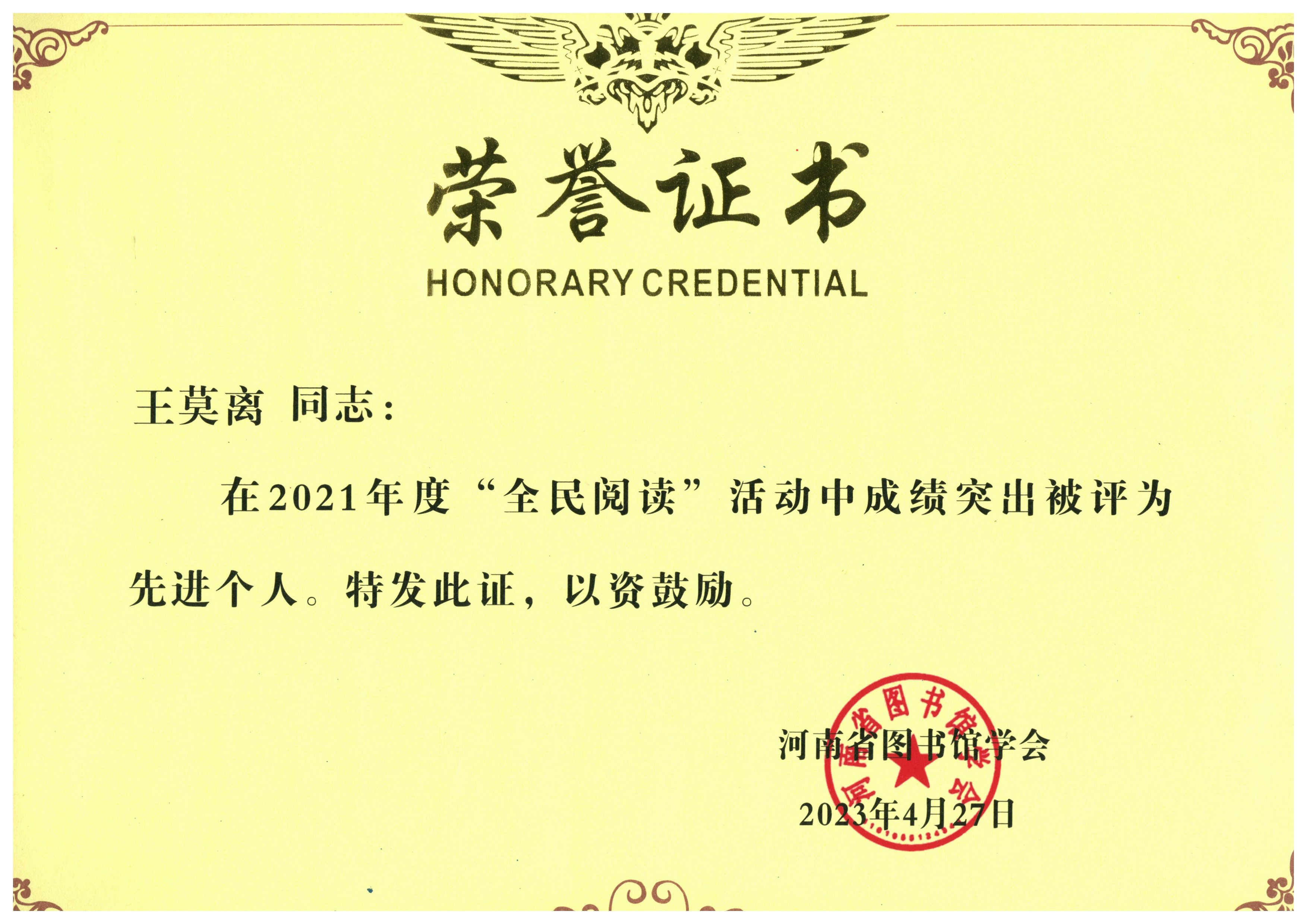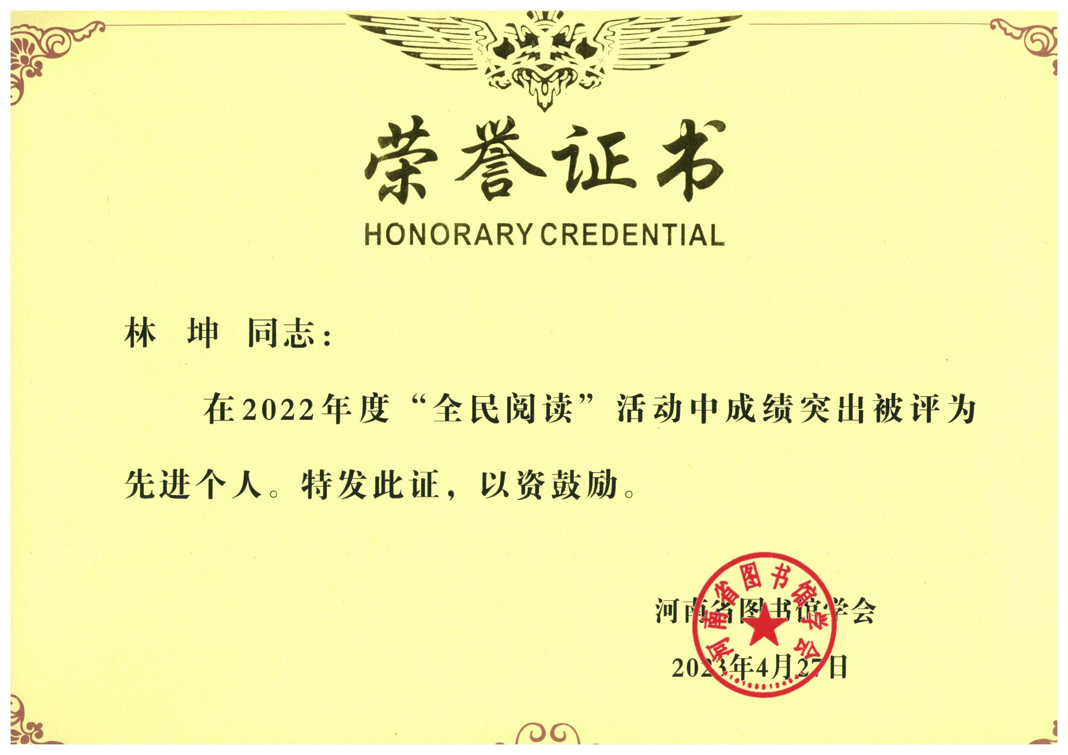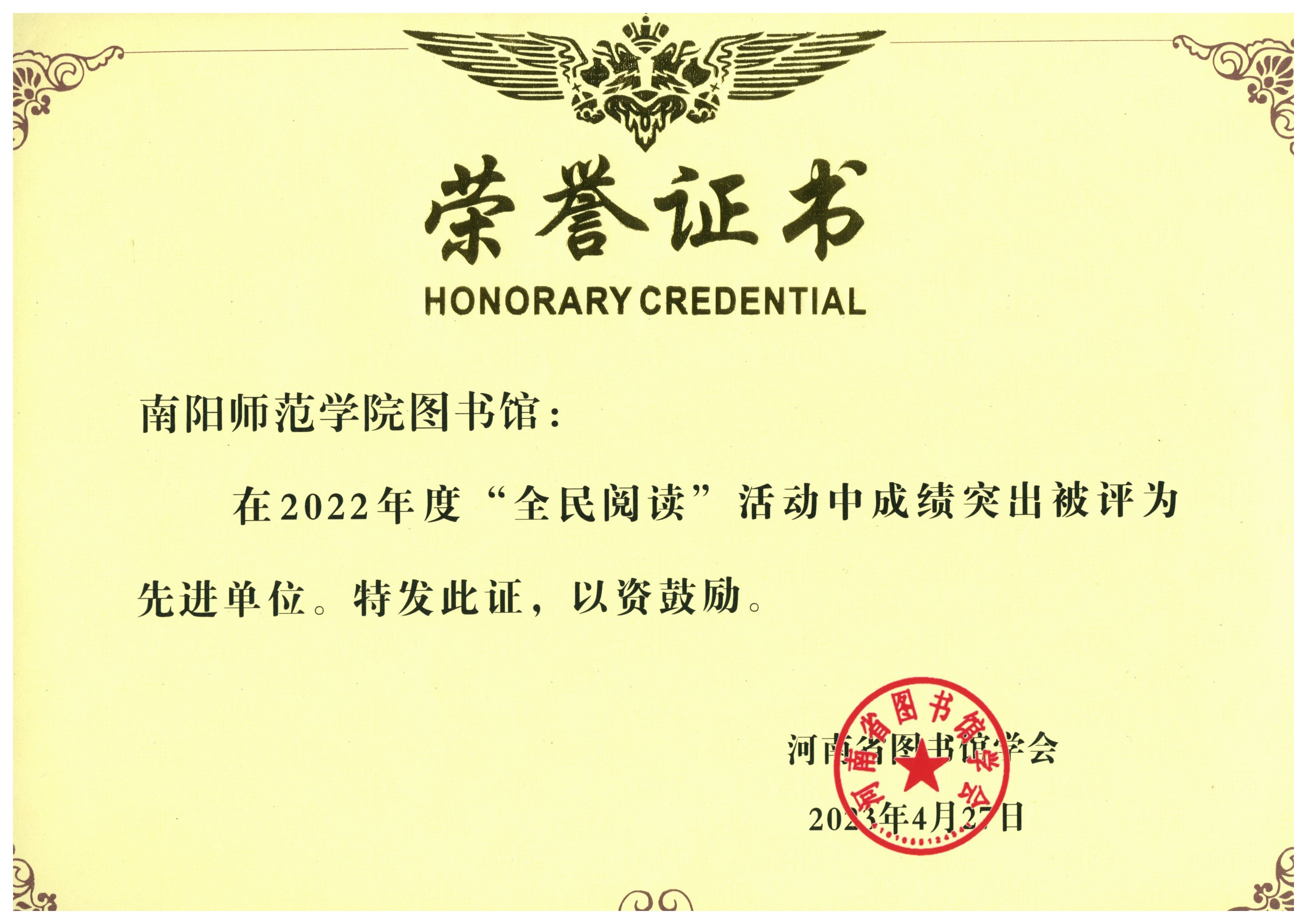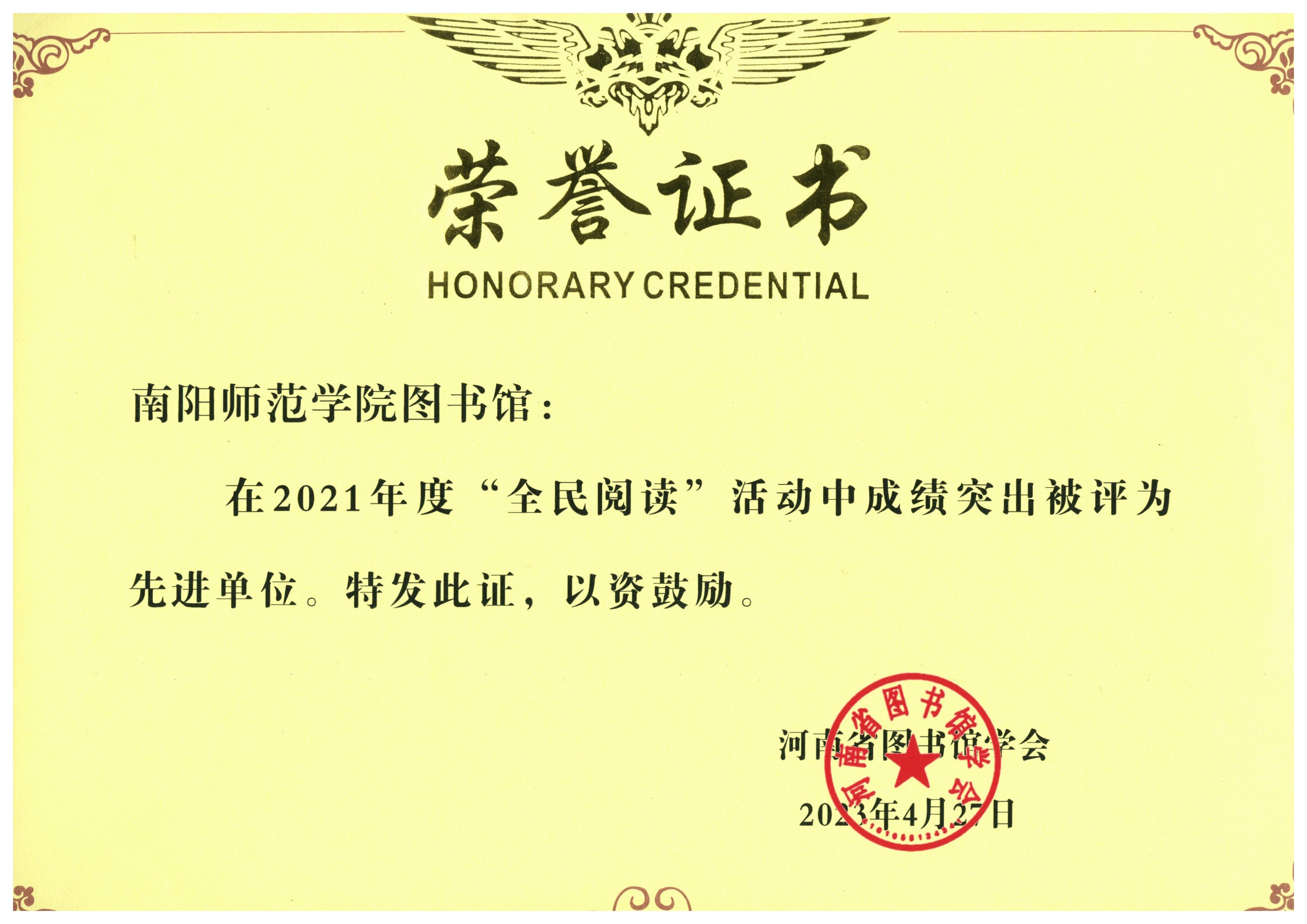 本网讯(通讯员 林坤)近日,河南省图书馆学会第十届二次全体理事会议在郑州召开。大会分别对2021年和2022年全省各级各类图书馆全民阅读活动进行了总结表彰。天游官网图书馆被评为2021年度和2022年度“全民阅读”先进单位;王莫离获得2021年度“全民阅读”先进个人称号,林坤获得2022年度“全民阅读”先进个人称号。