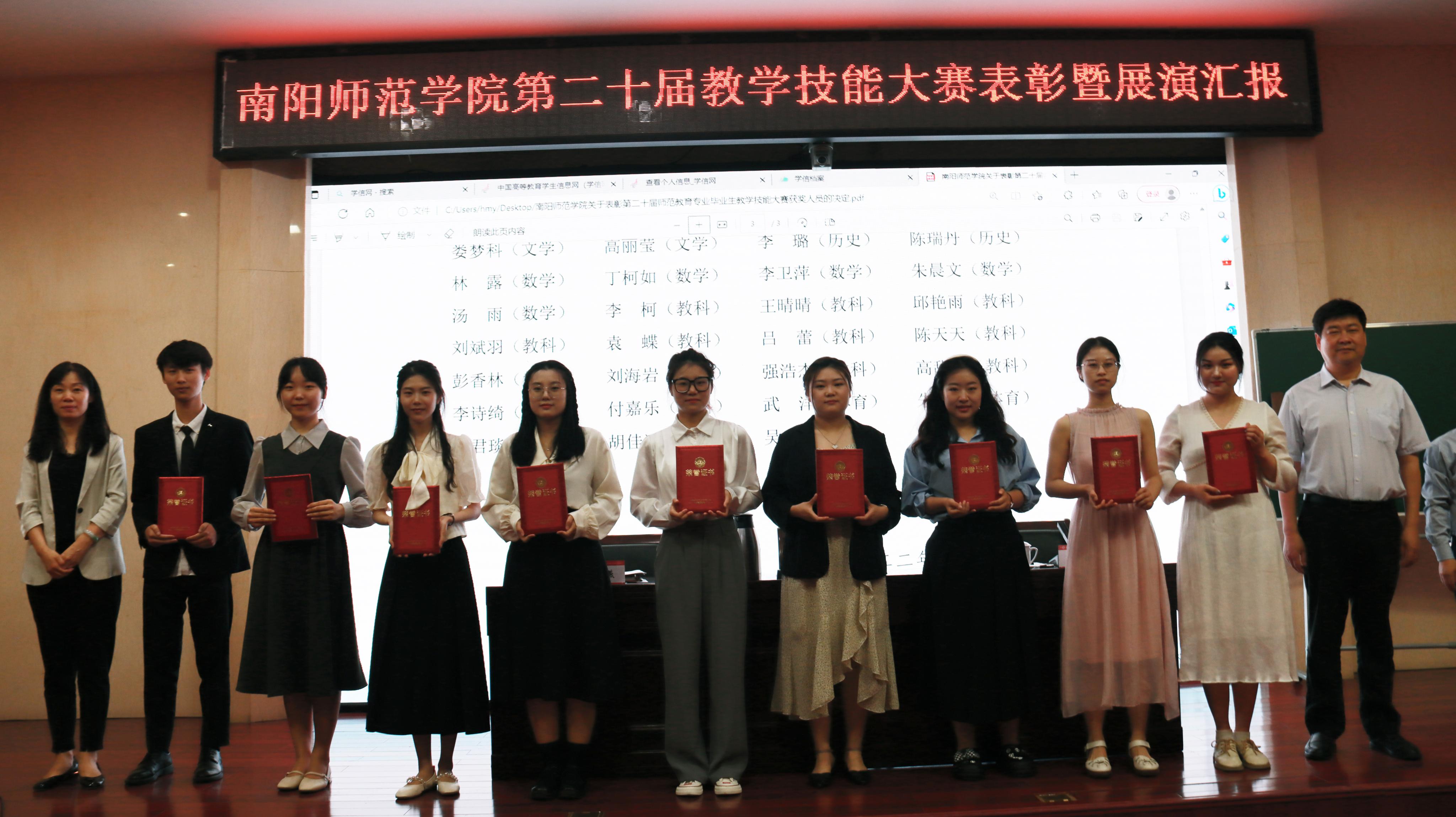 本网讯(通讯员 徐恒升)5月17日下午,教师发展中心在图书馆一楼报告厅举行第二十届师范教育专业毕业生教学技能大赛表彰暨汇报会。教务处、教师发展中心负责同志、各师范专业学院分管师范生教学技能大赛的副院长、教法教师代表,部分获奖学生及师范专业学生代表参加。