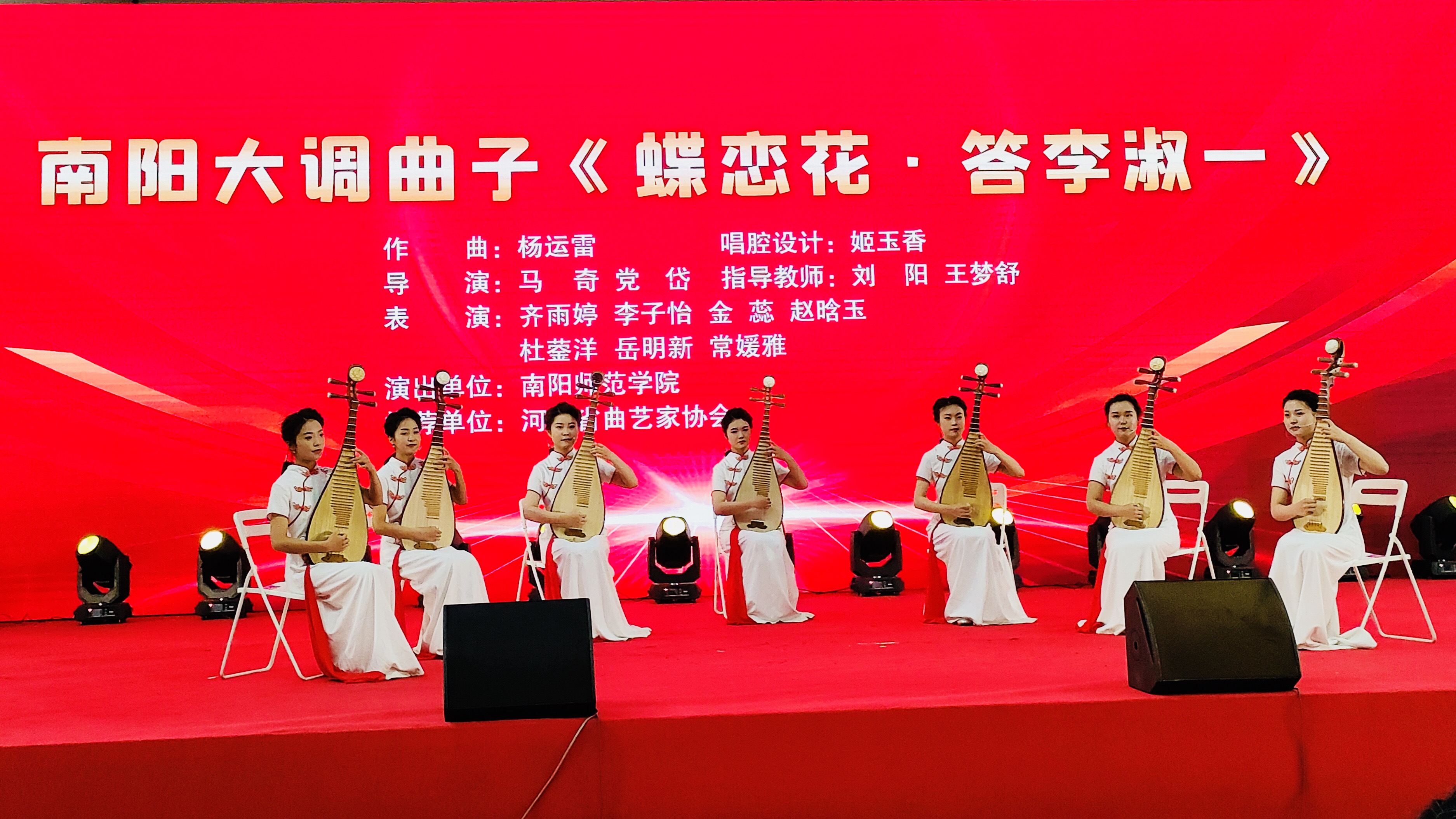 本届展演共征集到111个作品,涉及35个曲种,经过专家认真遴选,最终确定了21个曲种的37个优秀节目参加展演。天游官网选送的作品《蝶恋花·答李淑一》脱颖而出,入选最终优秀作品展演。作品将南阳大调曲子委婉细腻的唱腔风格与毛泽东诗词的浪漫主义气质和现实主义豪气完美地糅合在一起。同学们的精彩表演赢得了观演专家与观众的一致好评。