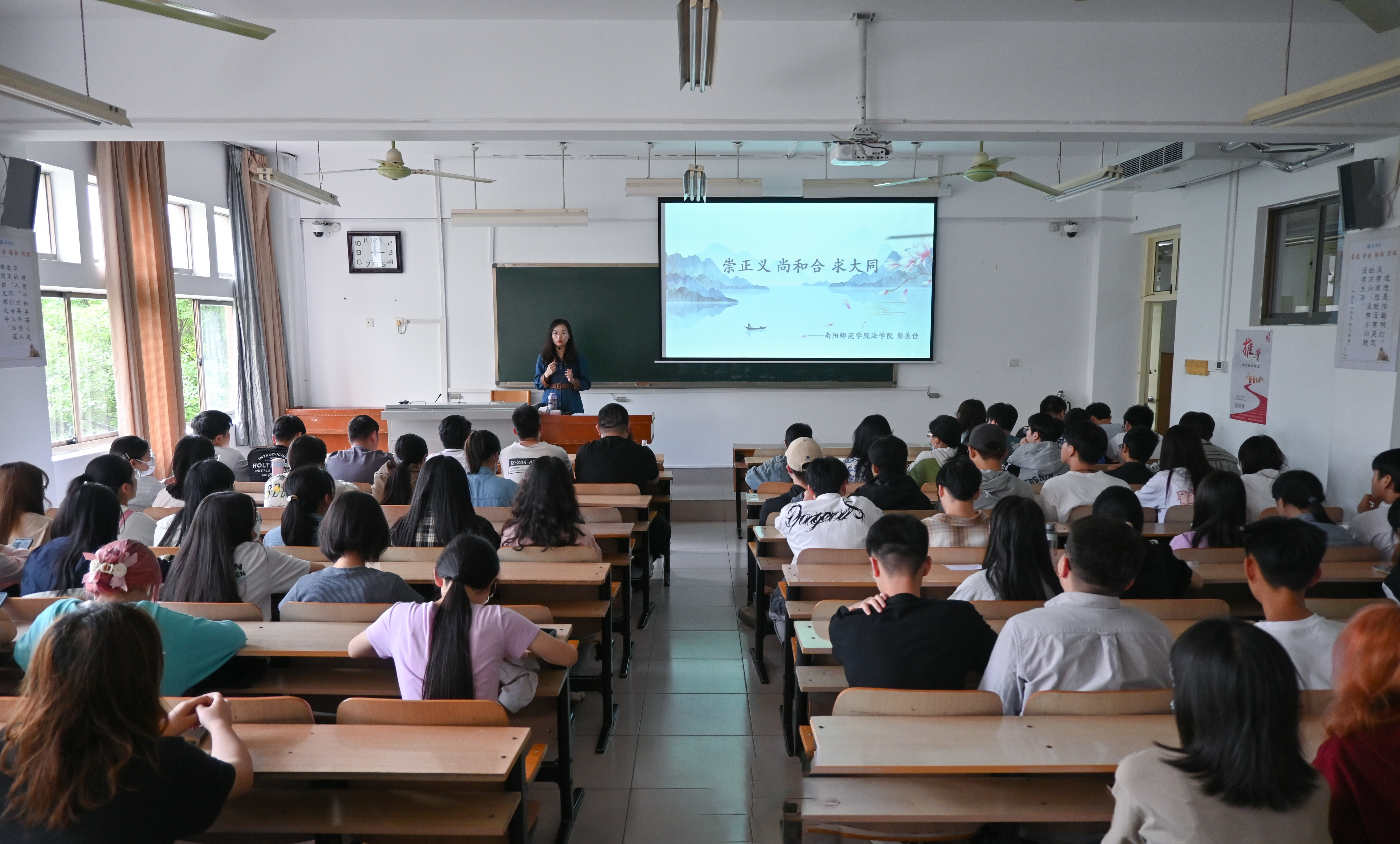 本网讯(陈欣 董嘉怡/文 郑宇棋/图)5月24日下午,天游官网以“崇正义尚和合求大同”为主题的第202期道德讲堂在逸夫楼N206教室举行。本次活动由法学院彭美佳老师担任主讲,该院2021级学生参加。