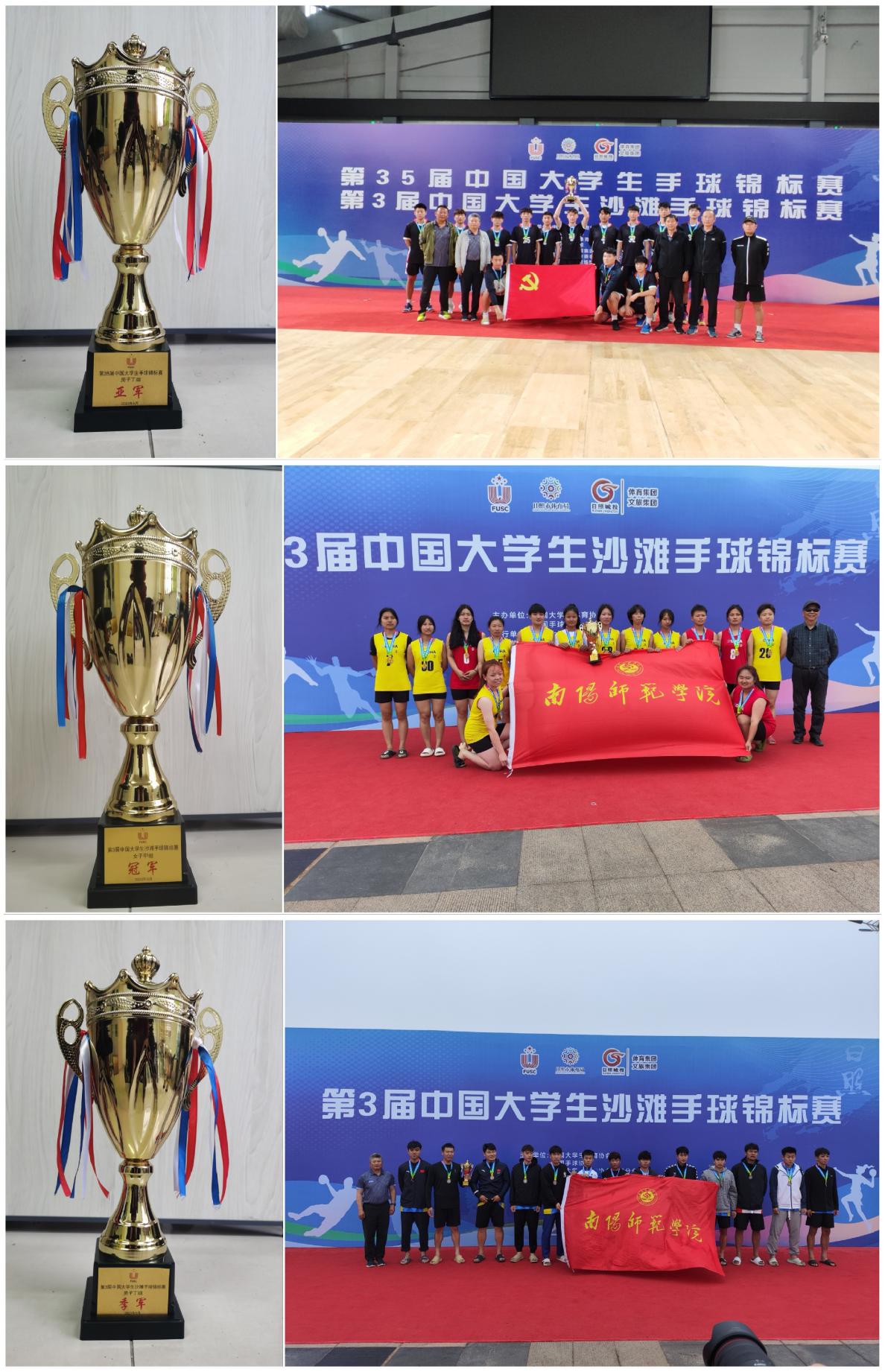 本网讯(孔冲/文 邓忠伟/图)5月20—27日,由中国大学生体育协会、中国手球协会联合主办的年度赛事——第三十五届中国大学生手球锦标赛暨第三届中国大学生沙滩手球比赛在山东日照开赛。比赛共设置甲组(普通组)、乙组(高职高专组)、丁组(超级组)三个组别。天游ty8线路1线路2检测中心大学生手球队在体育学院院长钱文军、教练耿晓伟、孔冲、邓忠伟、张晓康的带领下参与了女子甲组(普通组)和男子丁组(超级组)两个组别的室内手球和沙滩手球比赛,最终斩获第3届全国大学生沙滩手球锦标赛女子甲组冠军和男子丁组季军,第35届全国大学生手球锦标赛女子甲组第七名和男子丁组亚军。