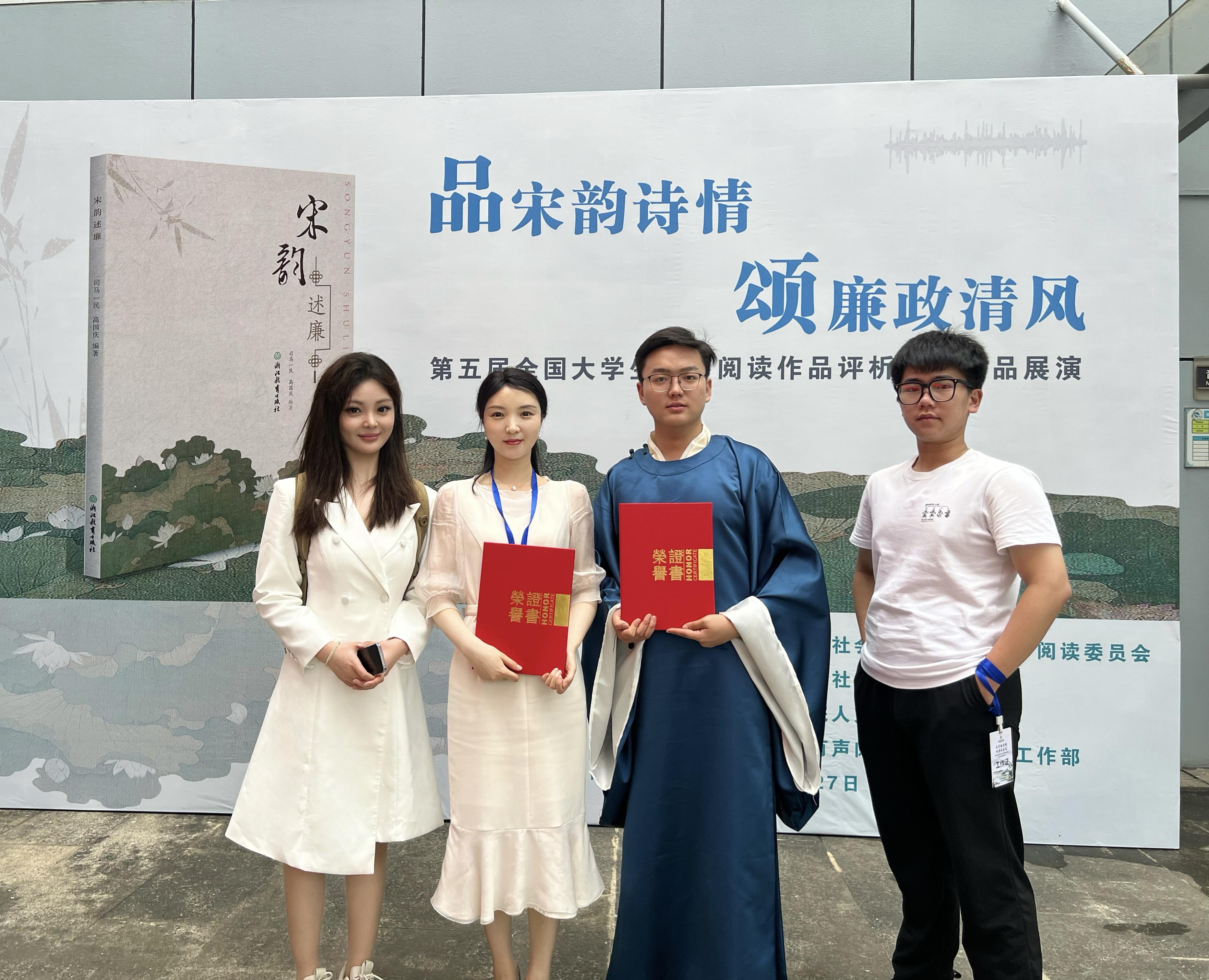 本网讯(通讯员 房艳凡)近日,第五届全国大学生有声阅读作品评析活动作品展演落下帷幕。天游官网房艳凡老师指导,周廷桢、赵涵、韩日林同学完成的作品《舒州被召试不赴偶书》经过两轮决赛的激烈角逐,荣获三等奖,天游ty8线路1线路2检测中心荣获优秀组织单位奖。
