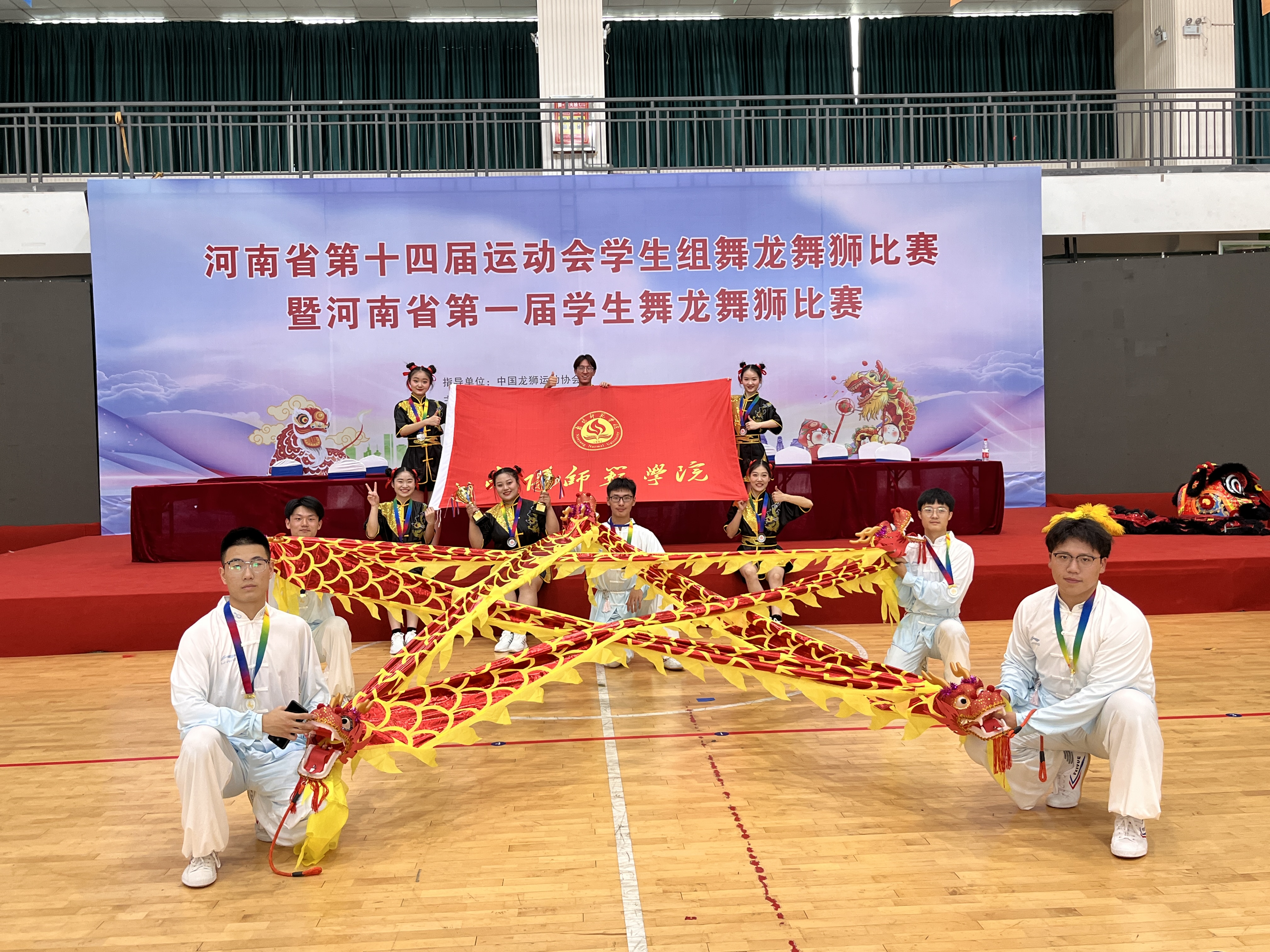 本网讯(鲁丽/文 何静/图)6月8日-11日,河南省第十四届运动会学生组舞龙舞狮比赛暨河南省第一届学生舞龙舞狮比赛在平顶山举行。此次比赛共有来自省内的15所高校近300名运动员参加,分别角逐舞龙、南狮、北狮、健身龙舞4个大项15个小项。天游ty8线路1线路2检测中心代表队派出11位参赛队员,获得健身龙舞《崛起中国龙》规定套路比赛第一名和《舞出我中华》规定套路比赛第三名的好成绩。这是天游官网首次参加此类项目并获奖,实现了龙狮项目零突破。