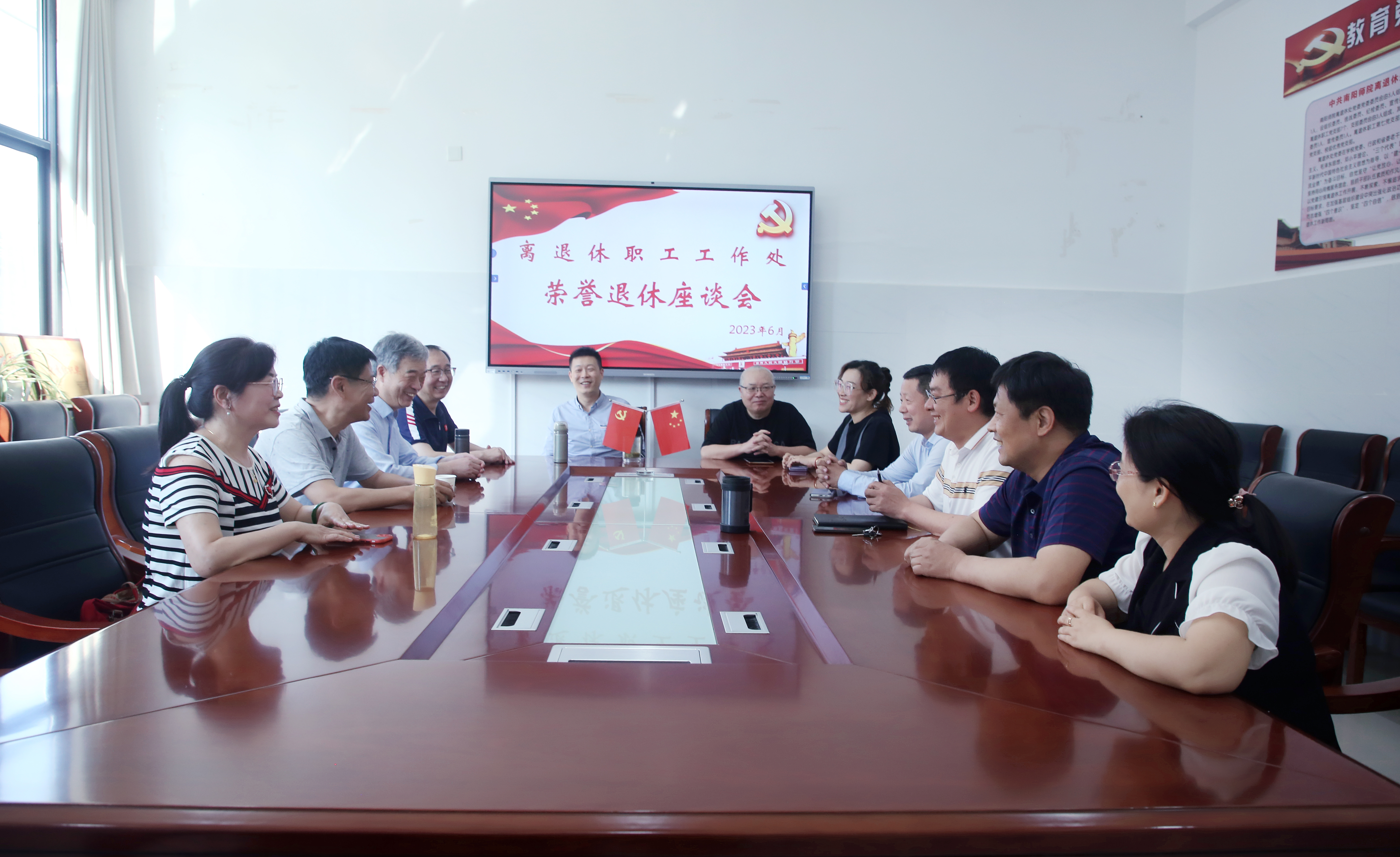 本网讯(李华杰/文 程虎/图)6月9日,离退休职工工作处在教职工活动中心举办荣誉退休座谈会。退休干部秦秀昌、闫荣义、符君健、李咏梅和离退休职工工作处全体工作人员参加。会议由离退休职工工作处处长赵贵义主持。