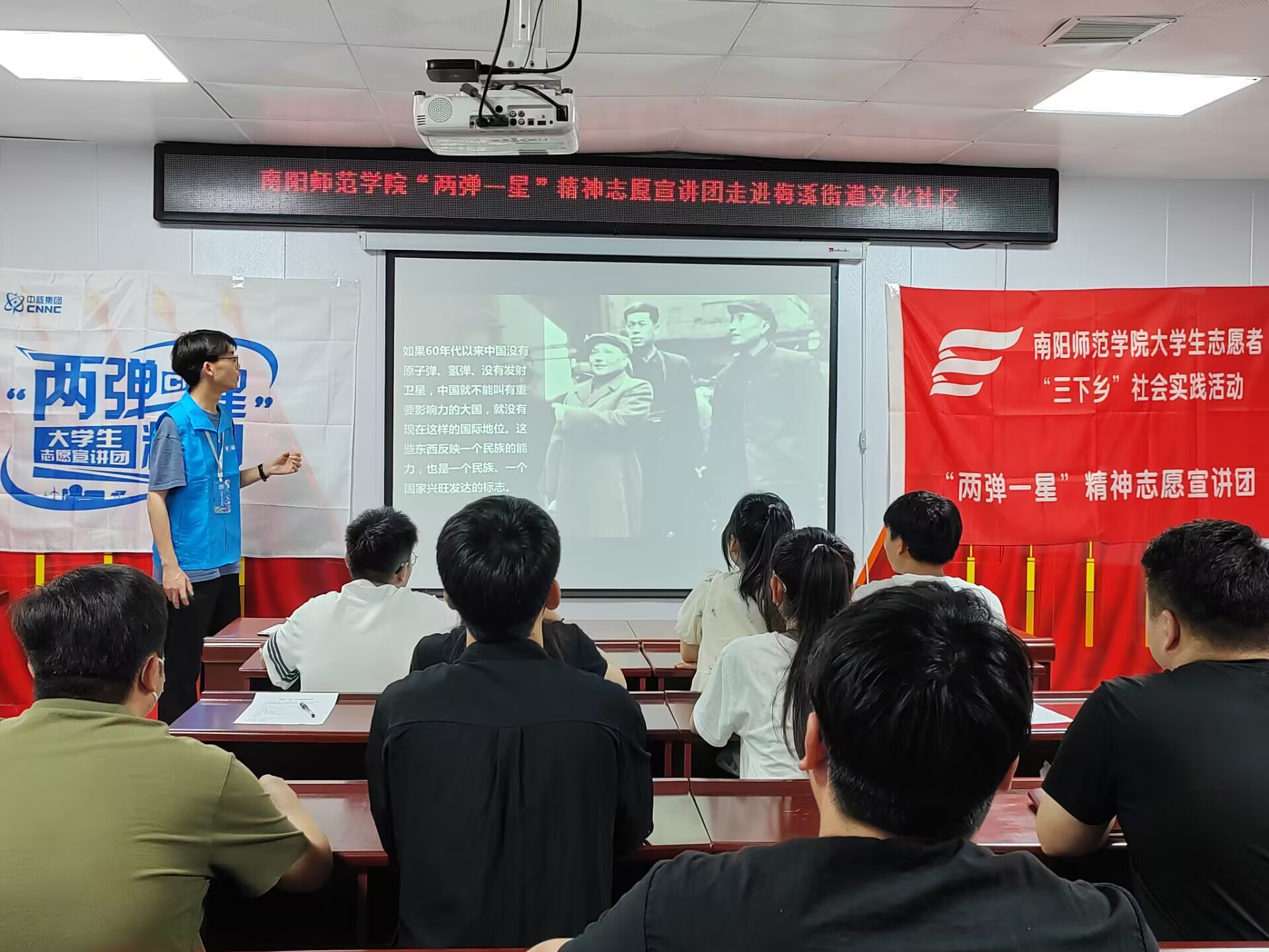 6月30日,物理与电子工程学院“两弹一星”精神志愿宣讲团赴南阳市卧龙区梅溪街道文化社区开展暑期“三下乡”社会实践活动。志愿者代表为社区居民们宣讲中核工业和“华龙一号”核电机组研发的艰辛历程等,通过分发宣讲手册、组织填写知识问卷,让“两弹一星”精神深入人心。随后,志愿者们带领社区小朋友开展“我心中的‘两弹一星’”趣味绘画活动,寓教于乐,在活动中收获新知。(编审 刘潇潇)