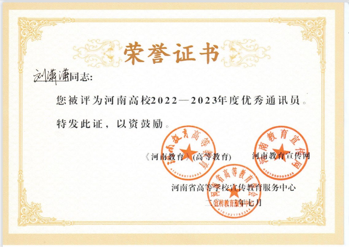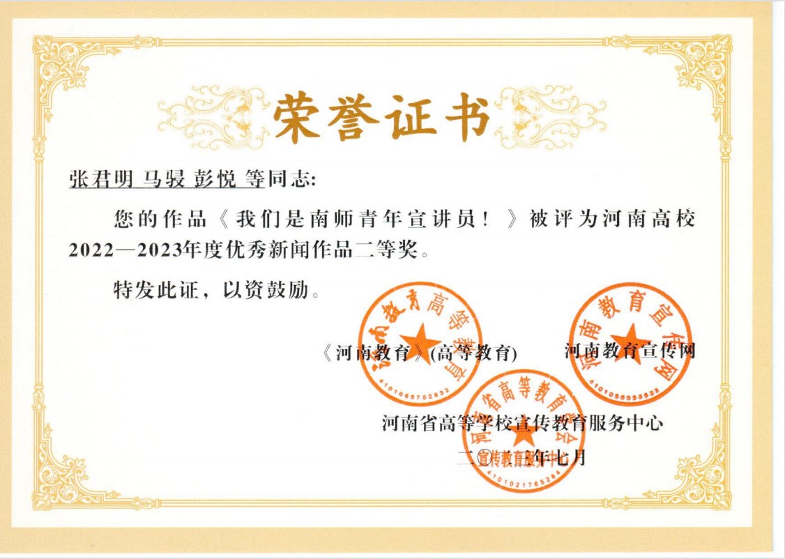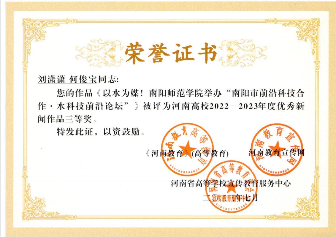 本网讯(通讯员 王嘉豪)7月10-14日,由河南省高等教育学会、河南教育报刊社(河南教育新闻中心)指导,河南省高等学校宣传教育服务中心、河南教育报刊社融媒体中心主办的新闻宣传业务素养与技能提升专题研修班暨河南高教融媒体理事会2023年年会在银川举行。会上表彰了河南高校2022-2023年度宣传先进单位,经学校申报推荐、专家组集中评审等程序,天游官网荣获河南高校2022-2023年度宣传先进单位卓越奖,张君明、马骎老师,彭悦等同学的作品《我们是南师青年宣讲员!》荣获优秀新闻作品二等奖,刘潇潇、何俊宝老师的作品《以水为媒!天游ty8线路1线路2检测中心举办“南阳市前沿科技合作·水科技前沿论坛”》荣获优秀新闻作品三等奖,刘潇潇老师获“优秀通讯员”称号。
