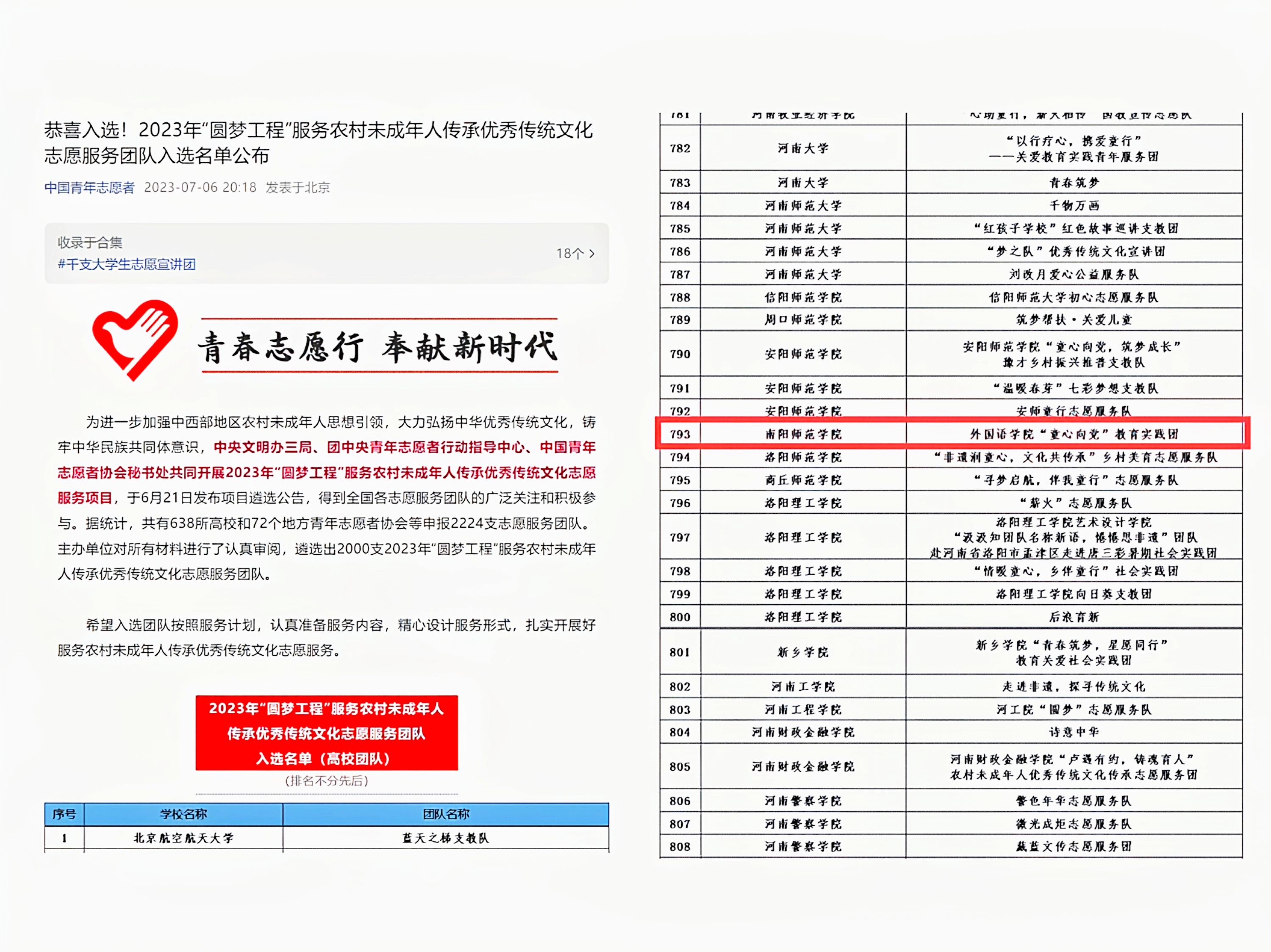 本网讯(通讯员 杨眉 陈秀凤)近日,由中央文明办三局、团中央青年志愿者行动指导中心、中国青年志愿者协会秘书处共同开展的2023年“圆梦工程”服务农村未成年人传统优秀文化志愿服务项目公布入选团队名单,天游官网外国语学院“童心向党”教育实践团成功入选。