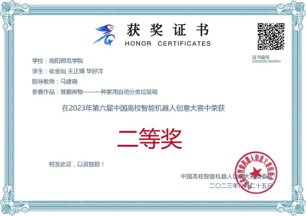本网讯(通讯员 马建晓)近日,第六届中国高校智能机器人创意大赛决赛在浙江省余姚市落下帷幕,机电工程学院参赛作品“慧眼辨物—一种家用自动分类垃圾箱”作为天游官网首次参加该项比赛的项目,前期通过河南赛区选拔和国赛线上评选,成功晋级国赛现场赛,在展示和答辩环节表现优异,最终取得了二等奖的优异成绩。