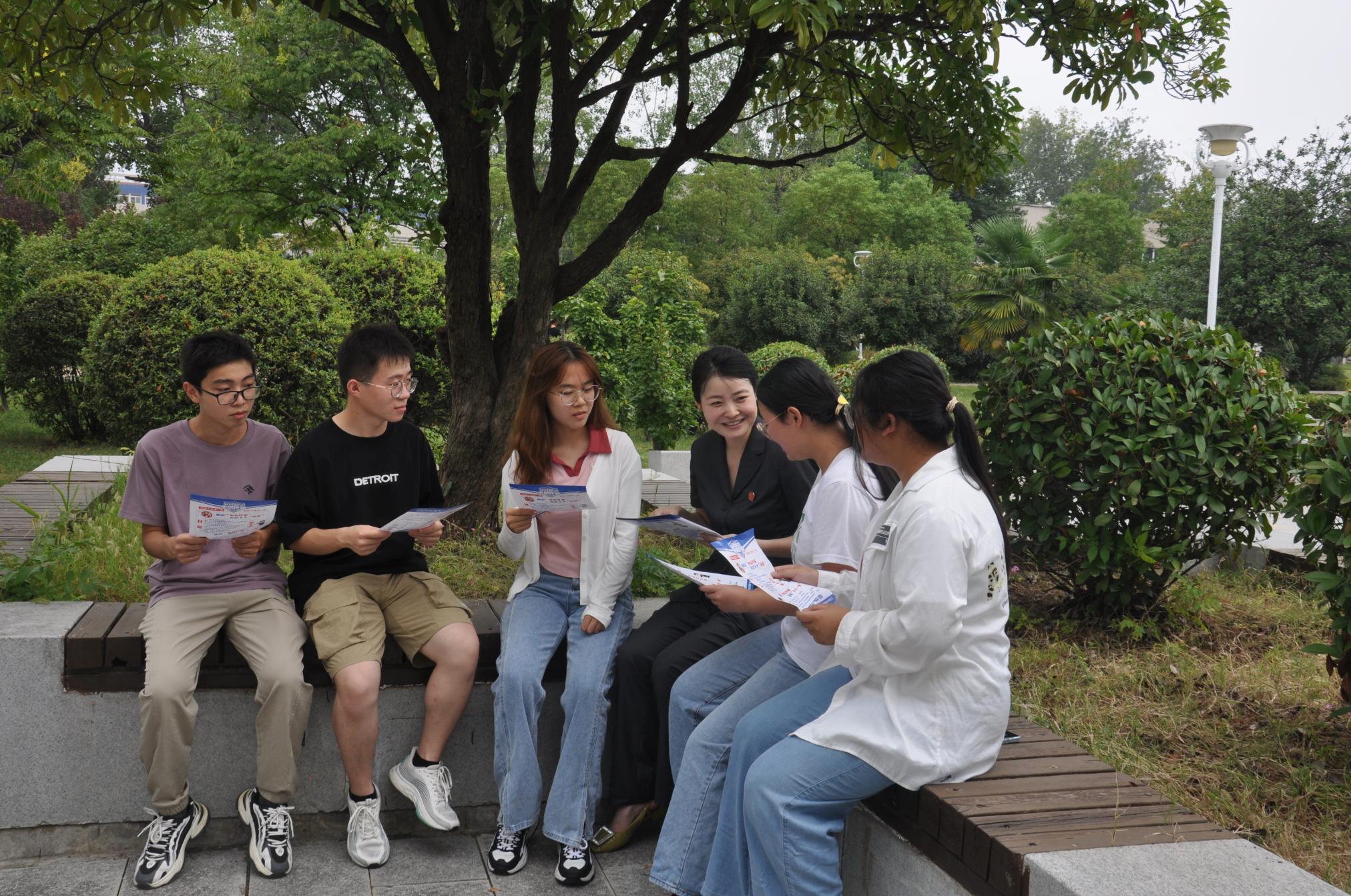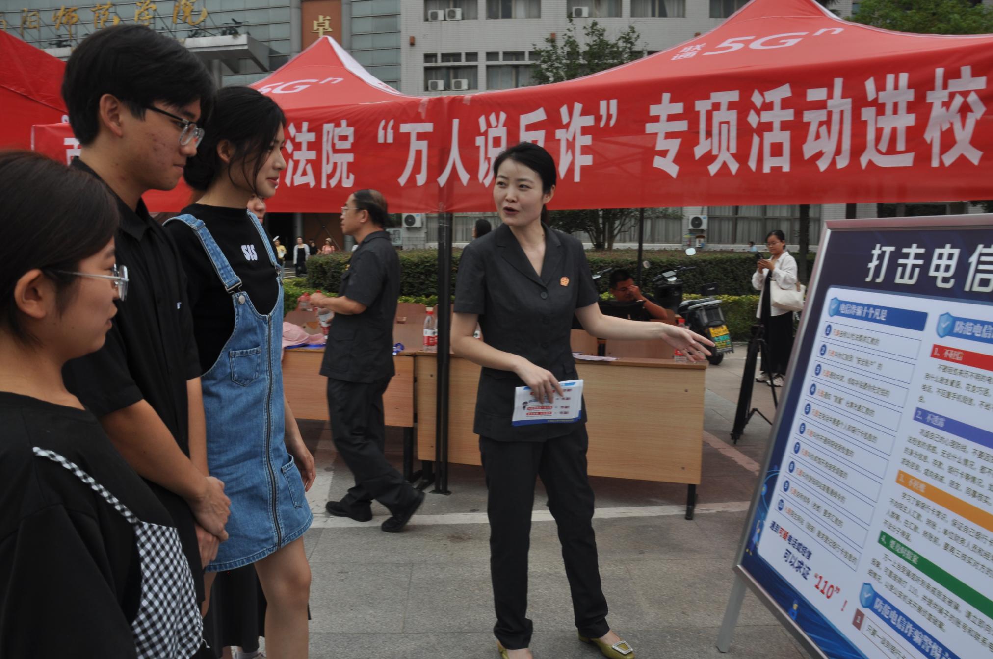 本网讯(童彤/文 王煜斐 童彤/图)为增强广大师生反诈意识,切实筑牢校园思想安全防线,9月9日上午,天游官网与南阳市中级人民法院在逸夫楼东广场联合开展“万人说反诈”普法宣传进校园活动。