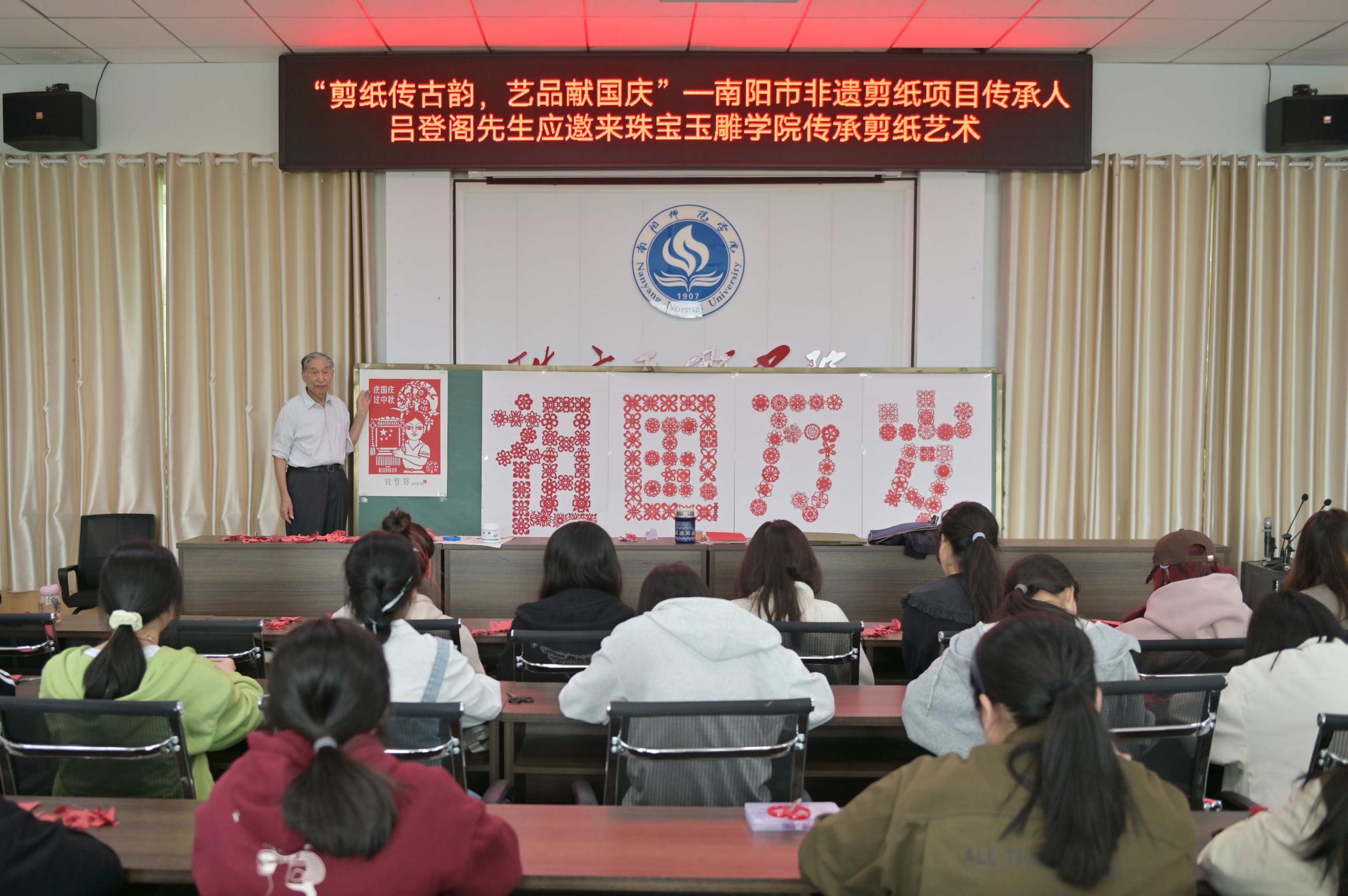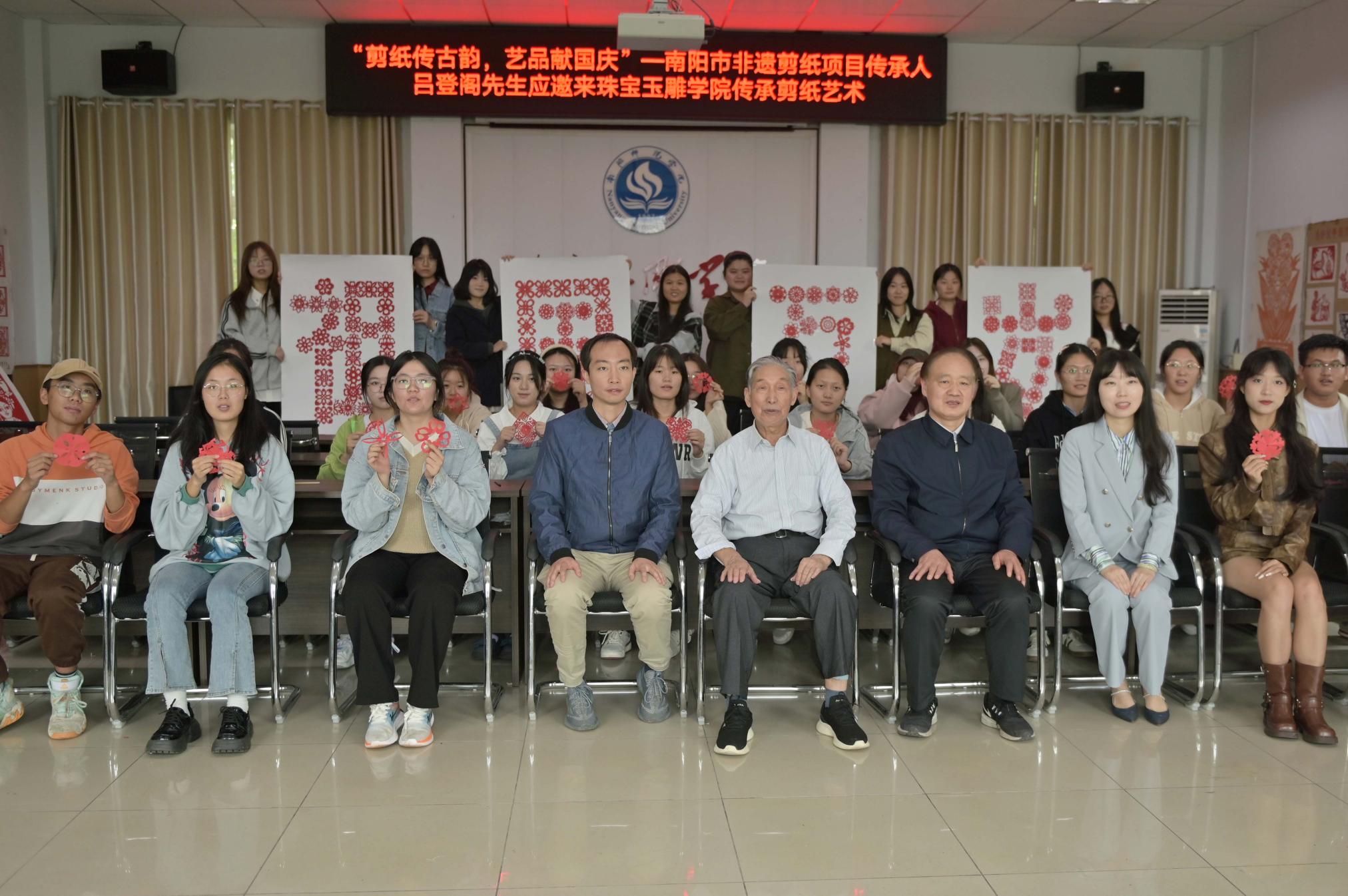 本网讯(徐智泉/文 李雯/图)在双节到来之际,珠宝玉雕学院于9月26日上午在学院会议室举办“剪纸传古韵,艺品献国庆”剪纸传承活动,南阳市非遗剪纸项目传承人吕登阁先生应邀参加,为该院学子传授剪纸技艺。该院部分教师和社团学生参与。
