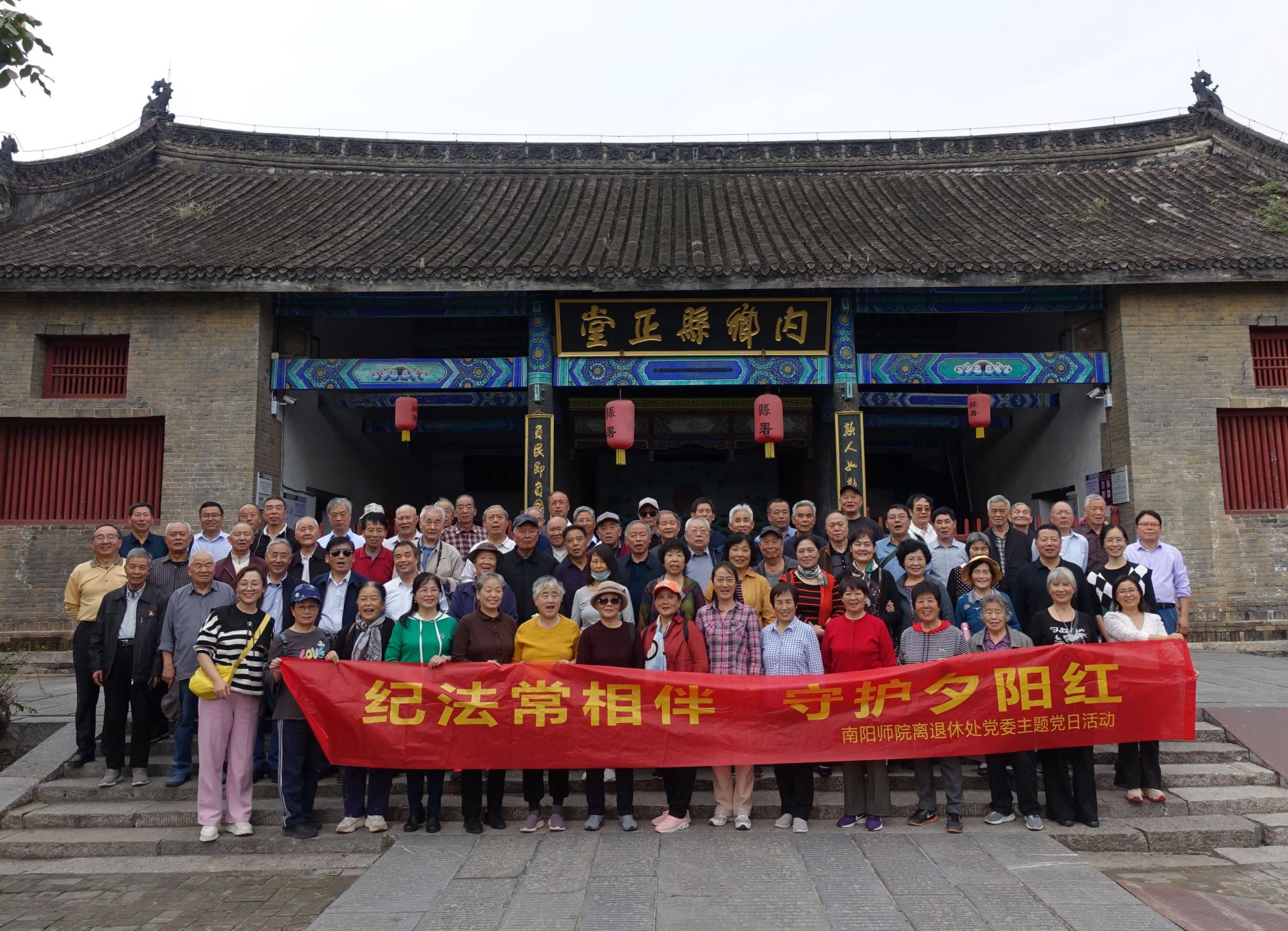 本网讯(李华杰/文 李伟/图)为深入贯彻落实党的二十大精神和习近平总书记关于严明党的纪律和规矩的重要论述,全面加强党的纪律建设,根据省委老干部局工作安排, 10月11日,离退休职工工作处党委组织90余名老党员赴内乡开展“纪法常相伴 守护夕阳红”主题党日活动。