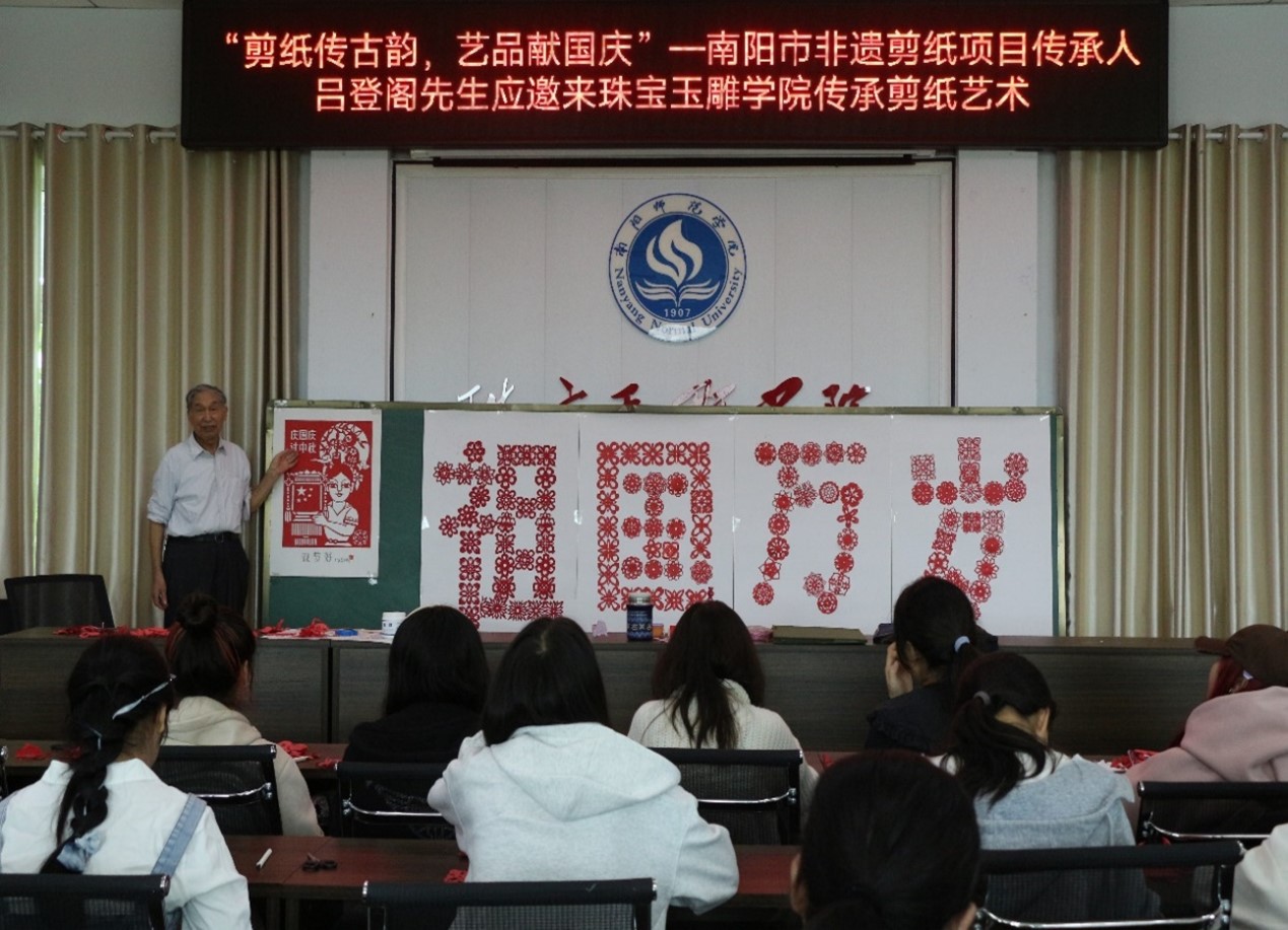 9月26日,学生非物质文化遗产剪纸社团在珠宝玉雕学院开展“剪纸传古韵,艺品献中秋”非遗文化剪纸活动。社团成员们在南阳市非遗剪纸传承人吕登阁先生的指导下创作剪纸作品,拼出“祖国万岁”四个大字为祖国庆生。