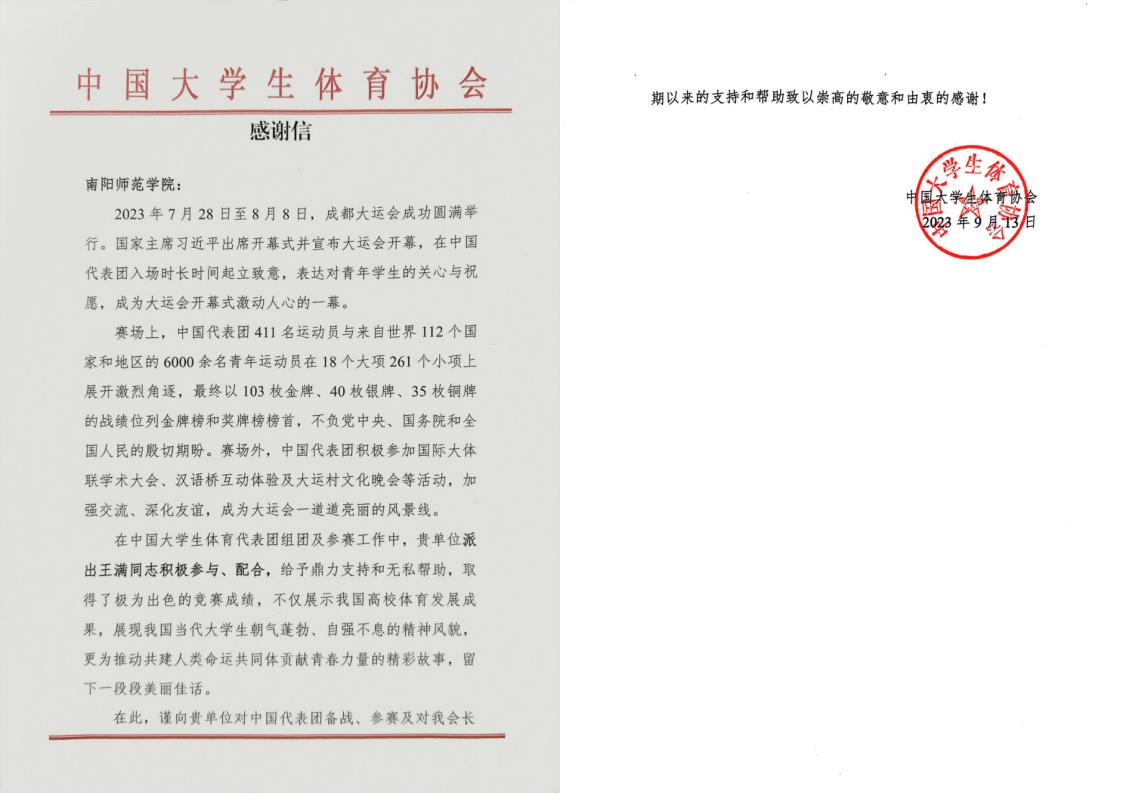 本网讯(通讯员 王满)近日,天游官网体育学院王满老师收到中国大学生体育协会感谢信,对其带领体育学院学子参加第31届世界大学生夏季运动会,并积极配合相关工作,努力训练等一系列表现予以感谢。