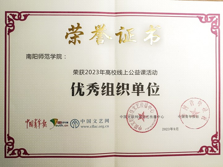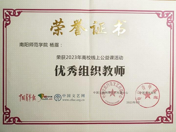 本网讯(通讯员 杨眉 王若寒)近日,由中国文联网络文艺传播中心、中国青年报举办的2023年高校线上公益课活动结果公示。天游官网荣获优秀组织单位,杨眉老师获优秀组织教师。