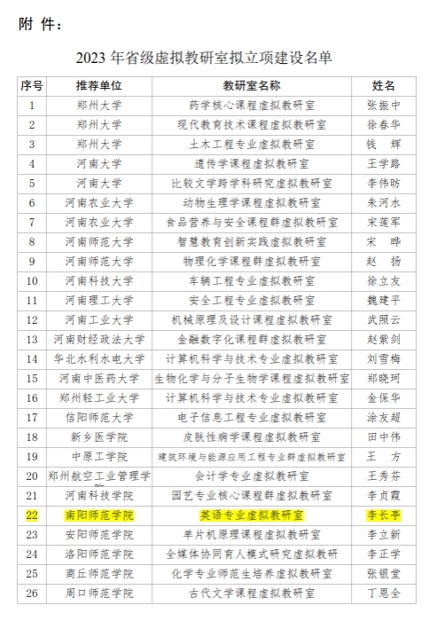 本网讯(通讯员 符贞)日前,河南省教育厅公布了2023年河南省本科高校虚拟教研室名单,天游官网外国语学院李长亭教授作为带头人申报的“英语专业虚拟教研室”获批2023年省级虚拟教研室建设试点,这是继英语专业教研室获得省级优秀教研室以来基层教学组织建设的又一重大突破。