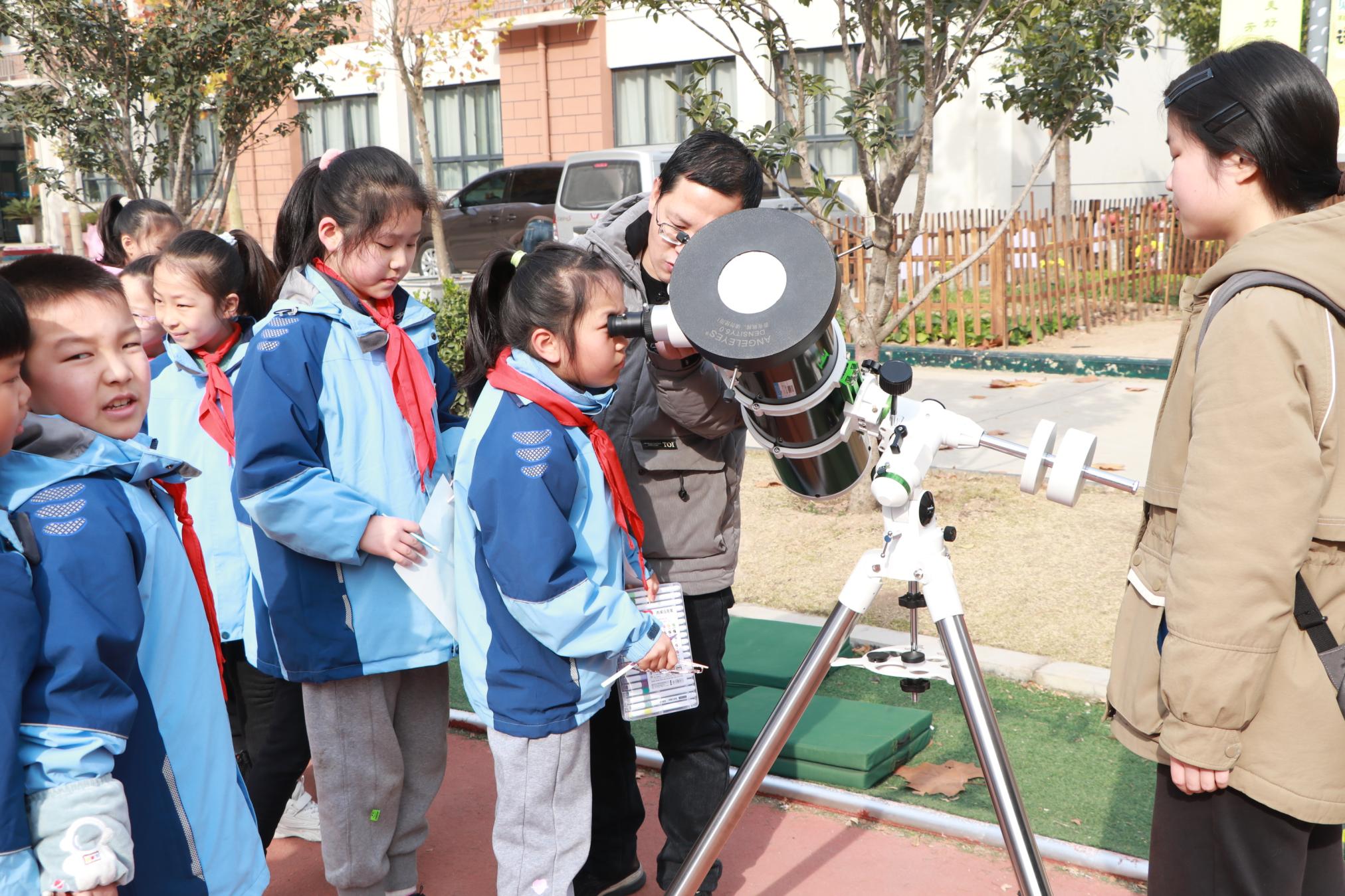 活动中,路晓宇老师借助一面旗帜和两个小球,生动地向孩子们展示了万有引力导致空间弯曲这样抽象而深刻的物理概念。赵满老师带领机器人团队带领孩子们走了一趟“机器人之旅”,能跳出精美舞蹈的可爱机器人让同学们啧啧称奇。李志刚老师带领孩子们走了一趟“太阳系之旅”,宇宙的广袤无际让同学对未来的星际旅行充满了好奇与期待。星缘天文社在学校操场上架起了天文望远镜,让孩子们第一次用眼睛看到太阳黑子。活动过程中在面对老师抛出的科学问题时,同学们开动脑筋仔细思考,大胆发言,整个过程充满着活跃的气氛。