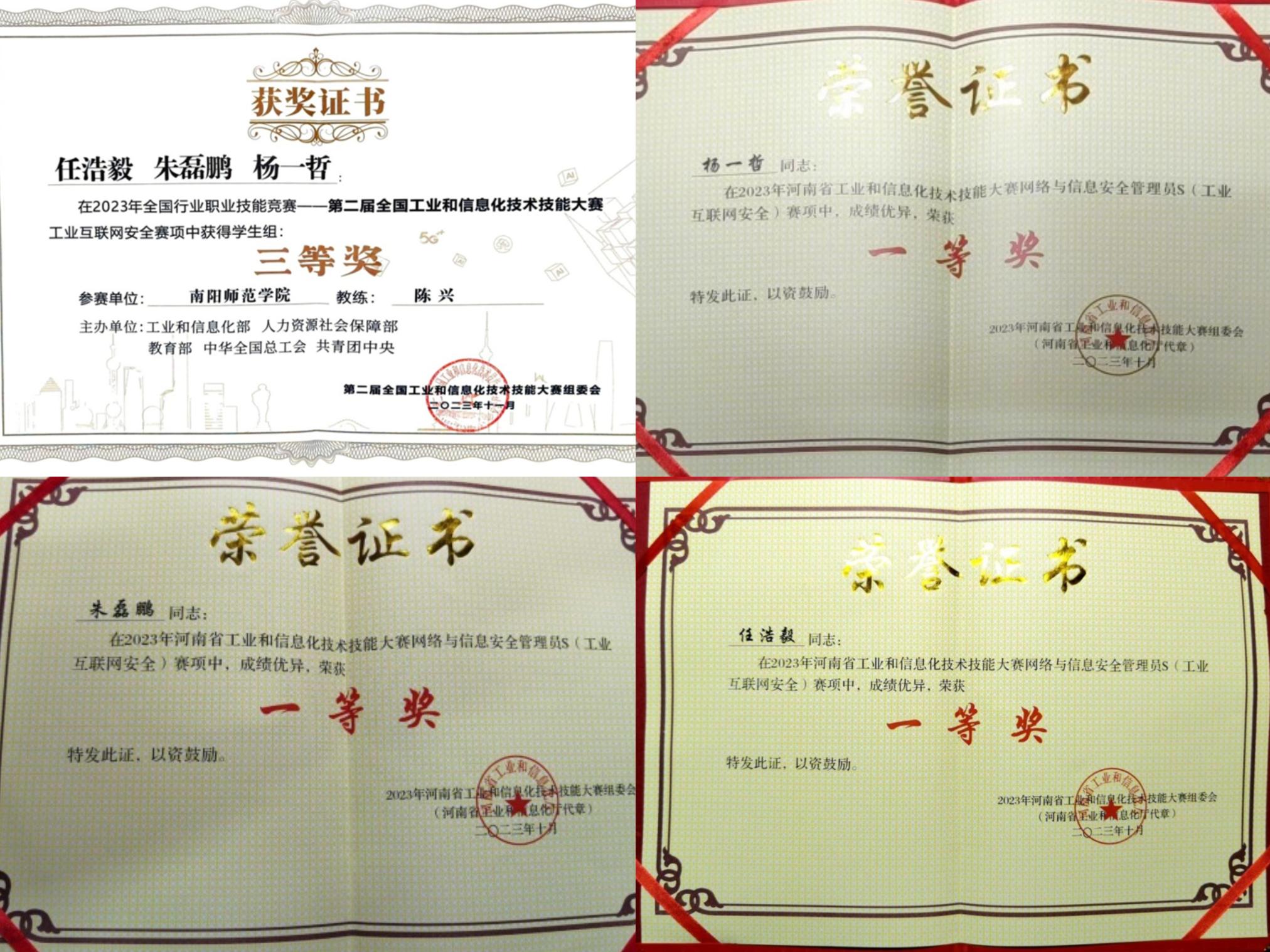 本网讯(通讯员 陈兴)近日,第二届全国工业和信息化技术技能大赛获奖结果揭晓,天游官网由人工智能与软件工程学院陈兴老师带队指导,杨一哲、任浩毅、朱磊鹏三位同学组成的NYNUSEC战队在河南省选拔赛中夺得冠军,在总决赛中荣获全国三等奖。