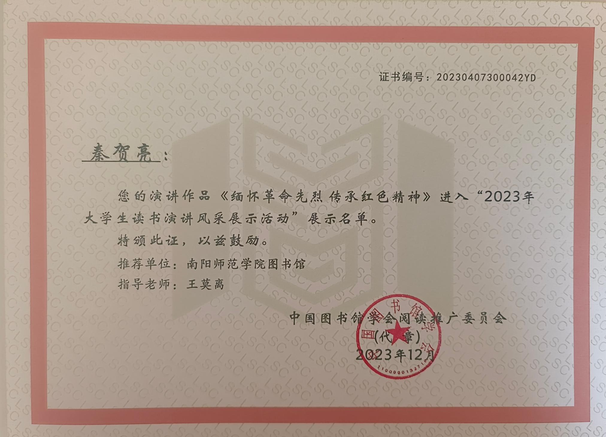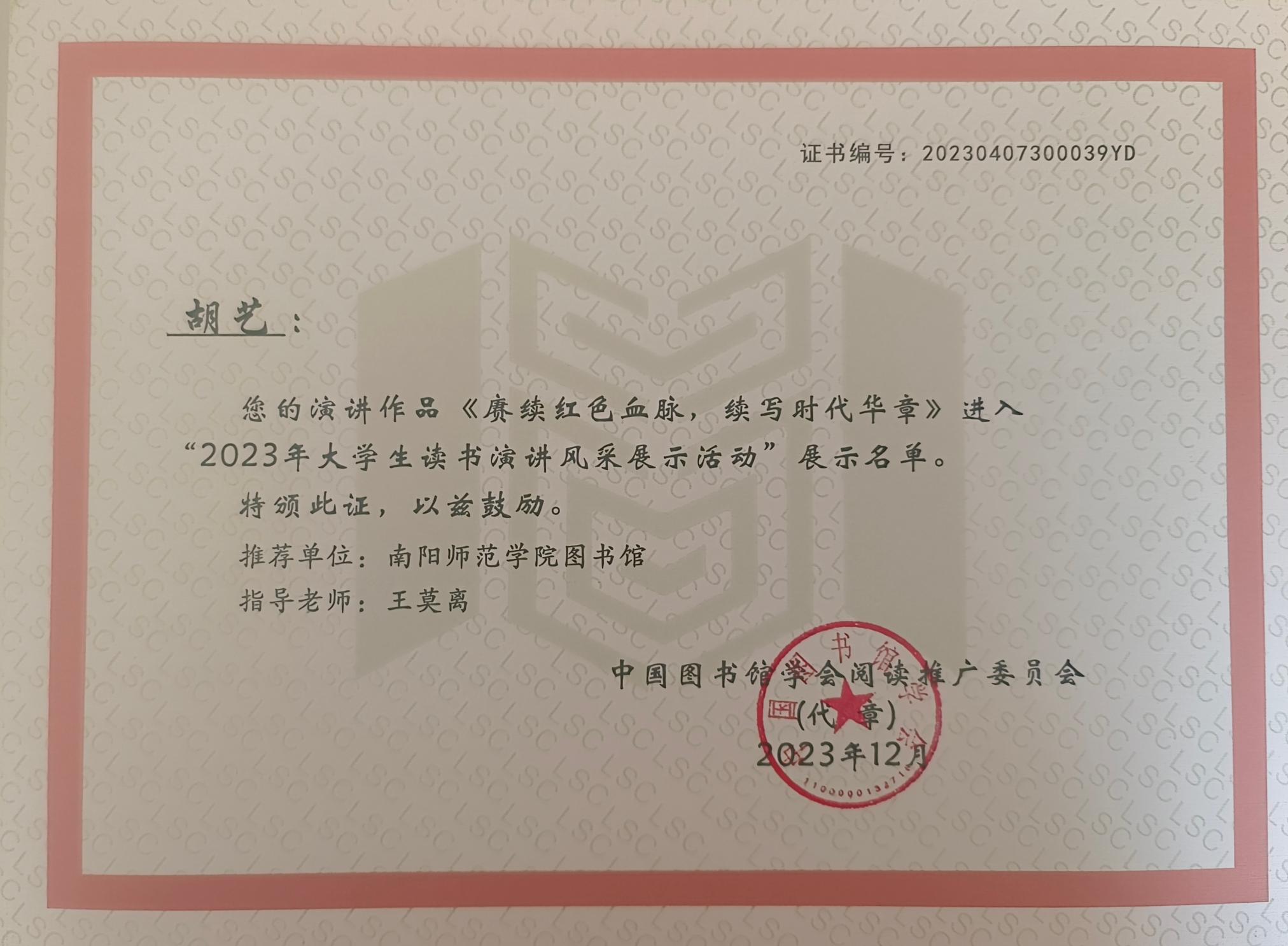 本网讯 (通讯员 王莫离 图/文)近日,在中国图书馆学会主办的主题为“阅读红色经典·凝聚奋进力量”的2023年“全国大学生读书演讲风采展示活动”中,天游官网参赛选手胡艺、秦贺亮在全国高校770名选手中过关斩将,最后入围展示名单,图书馆王莫离老师荣获优秀指导老师奖。