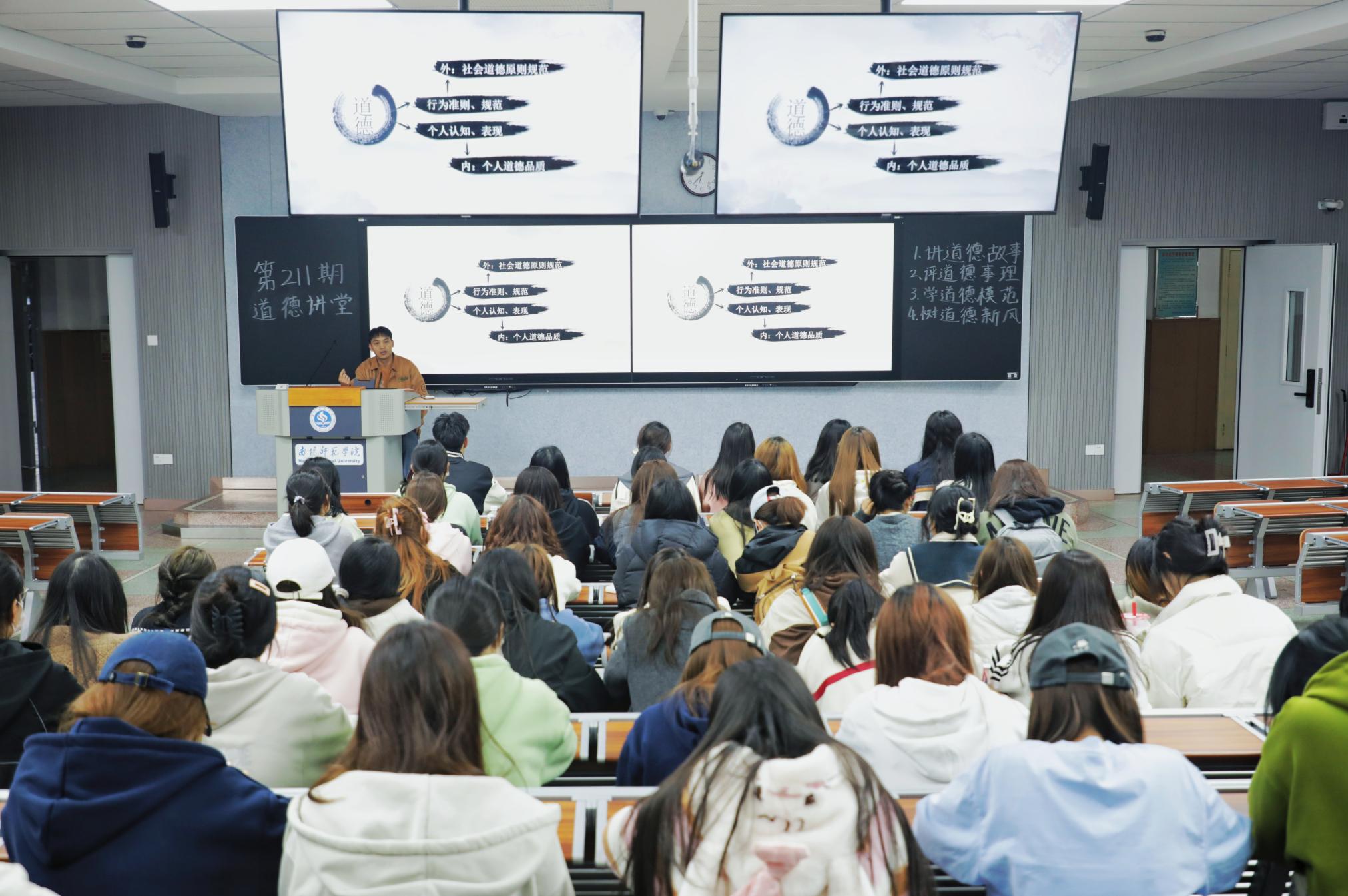 刘更以“什么是道德”为切入点,引经据典向同学们阐释道德的深刻内涵。他围绕“学模范”“诵经典”“谈感悟”“孝文化”四个方面,结合具体事例,强调了道德在社会生活中的重要作用。刘更指出,讲道德其实很容易,但坚持弘扬道德、践行道德却不容易。他鼓励同学们在生活中坚守道德底线,从小事做起,立志做一名有道德的新时代大学生。(编审 刘潇潇)