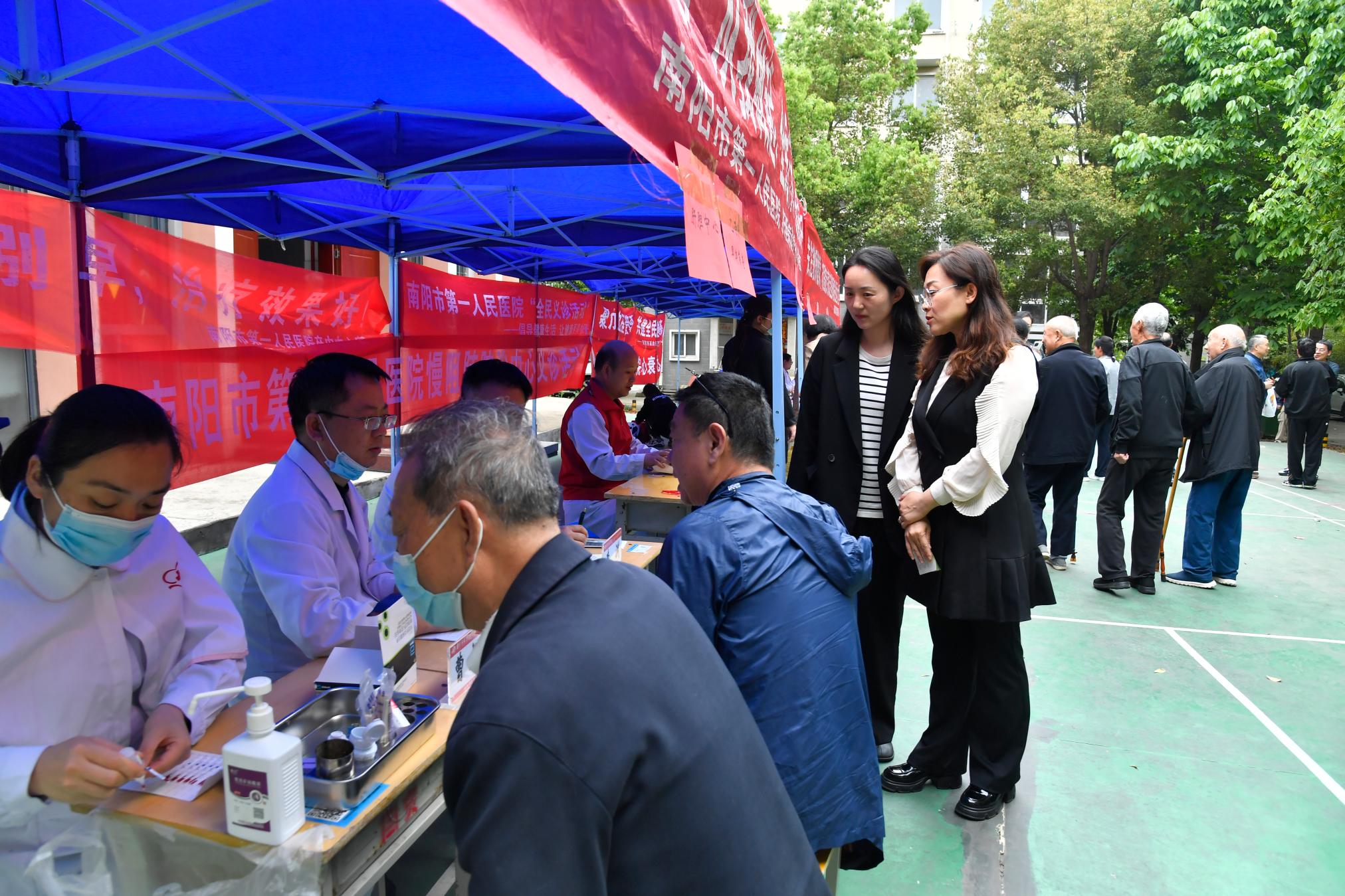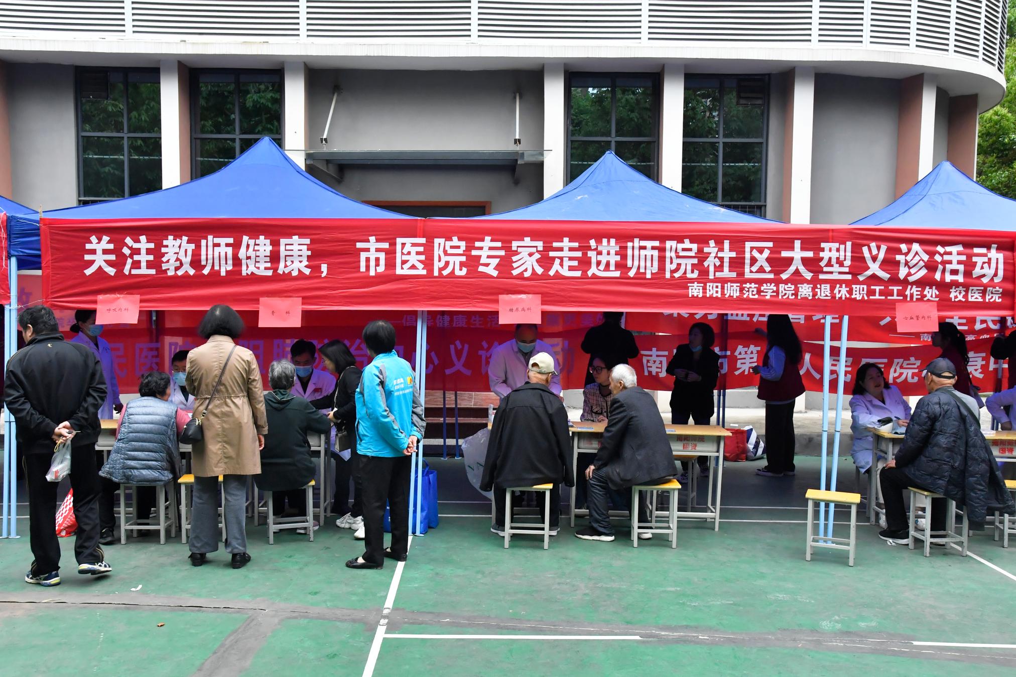 本网讯(马春苹/文 冯一珺/图)为关爱广大退休老同志及社区居民的身体健康,4月16日下午,天游官网关工委、离退休职工工作处携手校医院,邀请南阳市第一人民医院心血管内科、神经内科、呼吸内科、骨科、肝胆中心科、糖尿病科、妇科等各科室专家一行22人,在教职工活动中心西侧广场开展“关注教师健康,市医院专家走进师院社区”大型义诊活动,为退休老同志们提供全方位的健康服务。近三百位老同志及居民前来就诊咨询。