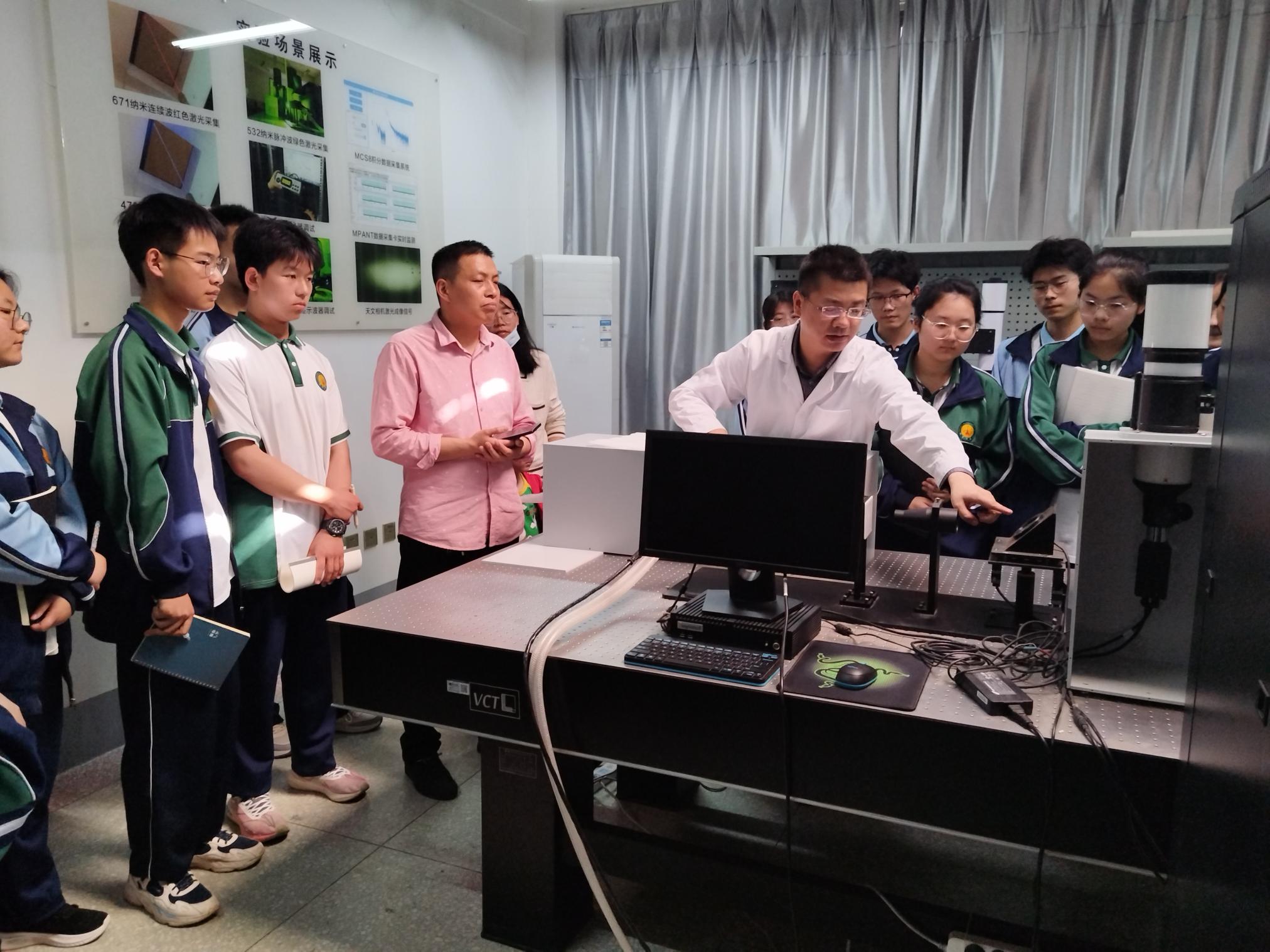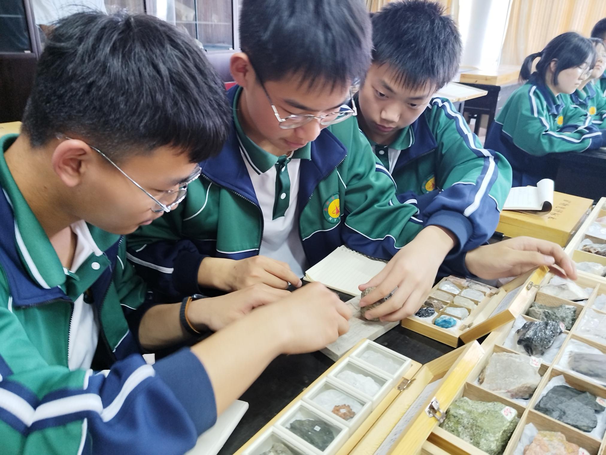 在启航楼河南省环境激光遥感技术与应用工程研究中心,张淼博士向中学生普及了遥感基础知识,结合实验室观测设备讲解了激光雷达实验仪器的工作原理以及在大气污染预警与防治、生态环境保护等领域的重大意义;在地质标本室,冯杨伟博士向学生们讲解了矿物、岩石基本概念及三大岩石基本类型,指导同学们用刻画岩石、放大镜观测等多种方法鉴定矿物与岩石;在地理实训室,白景峰教授指导同学们体验AR影像,结合虚拟现实场景讲解月相变化,结合沙盘理解等高线,并实操了部分地理小实验。