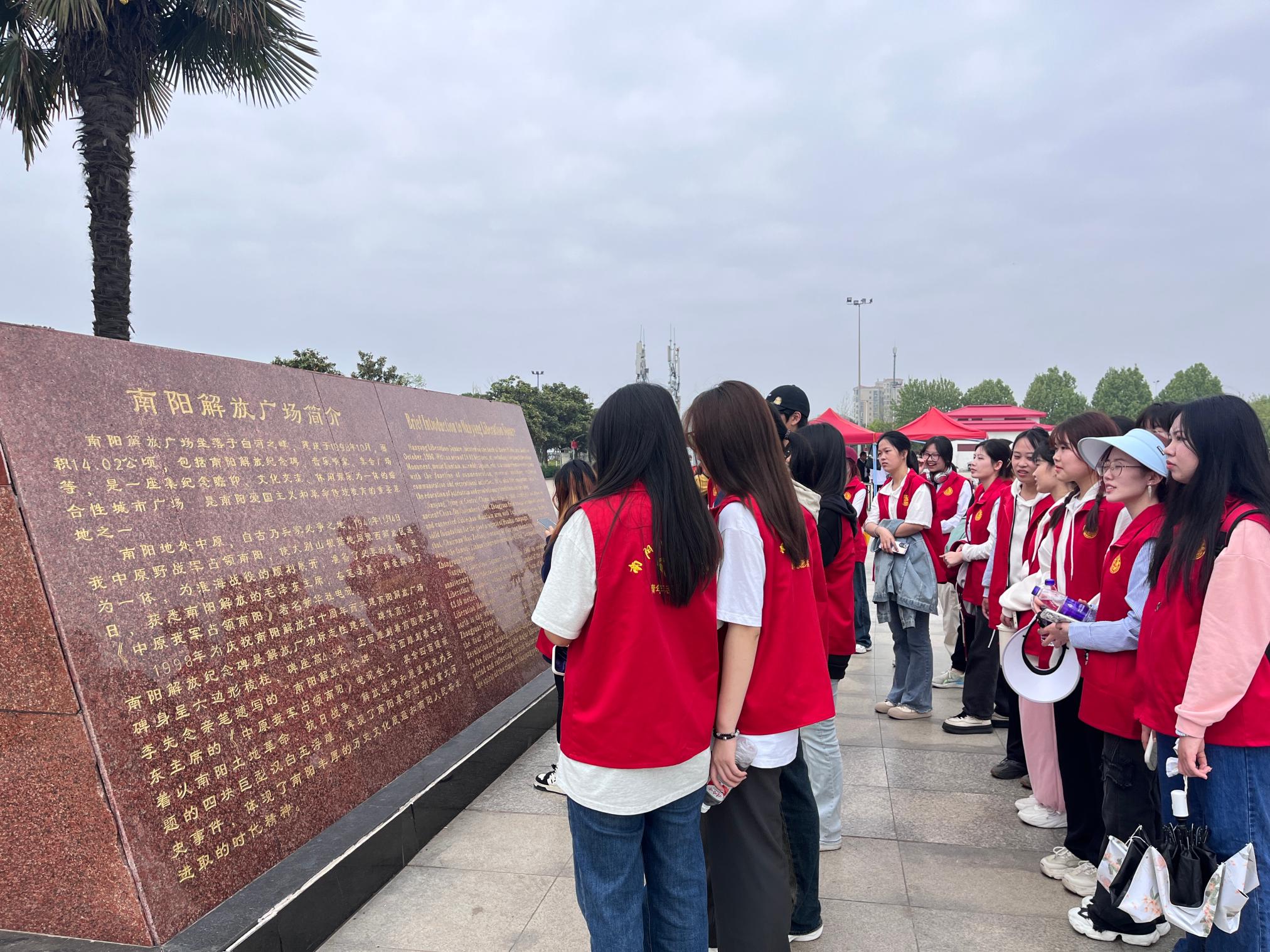 4月13日,马克思主义学院青年团员在南阳市解放广场开展“南师学子·行走南阳”主题团日活动。马克思主义学院团委书记刘哲向大家介绍解放广场背后的故事,团员们驻足瞻仰解放纪念碑及其底座浮雕,共同重温历史历程,在学习红色基因中坚定信念,承担责任使命。