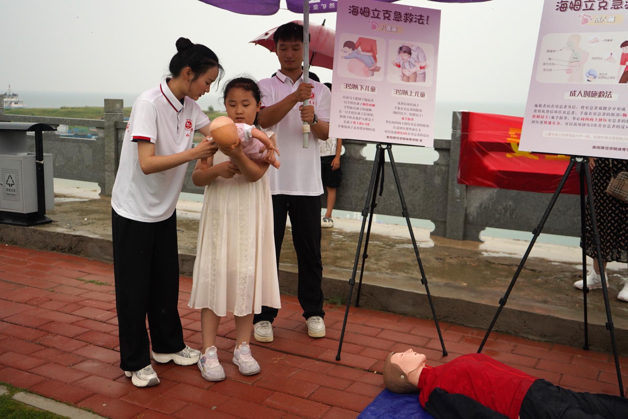 7月19日,体育学院前往南阳市淅川县开展“体智同行,以体筑梦”暑期三下乡社会实践活动。为增强老幼群体应对突发健康问题的自救互救能力,志愿者们利用在校学习的应急救护知识,为当地群众举行了一场防溺水和急救知识专题讲座。随后又借助专业教学仪器,现场演示了心肺复苏和海姆立克救援法的操作流程及注意事项,并邀请当地居民现场亲身体验,熟练急救技巧以增强自身急救能力。(编审 刘潇潇)