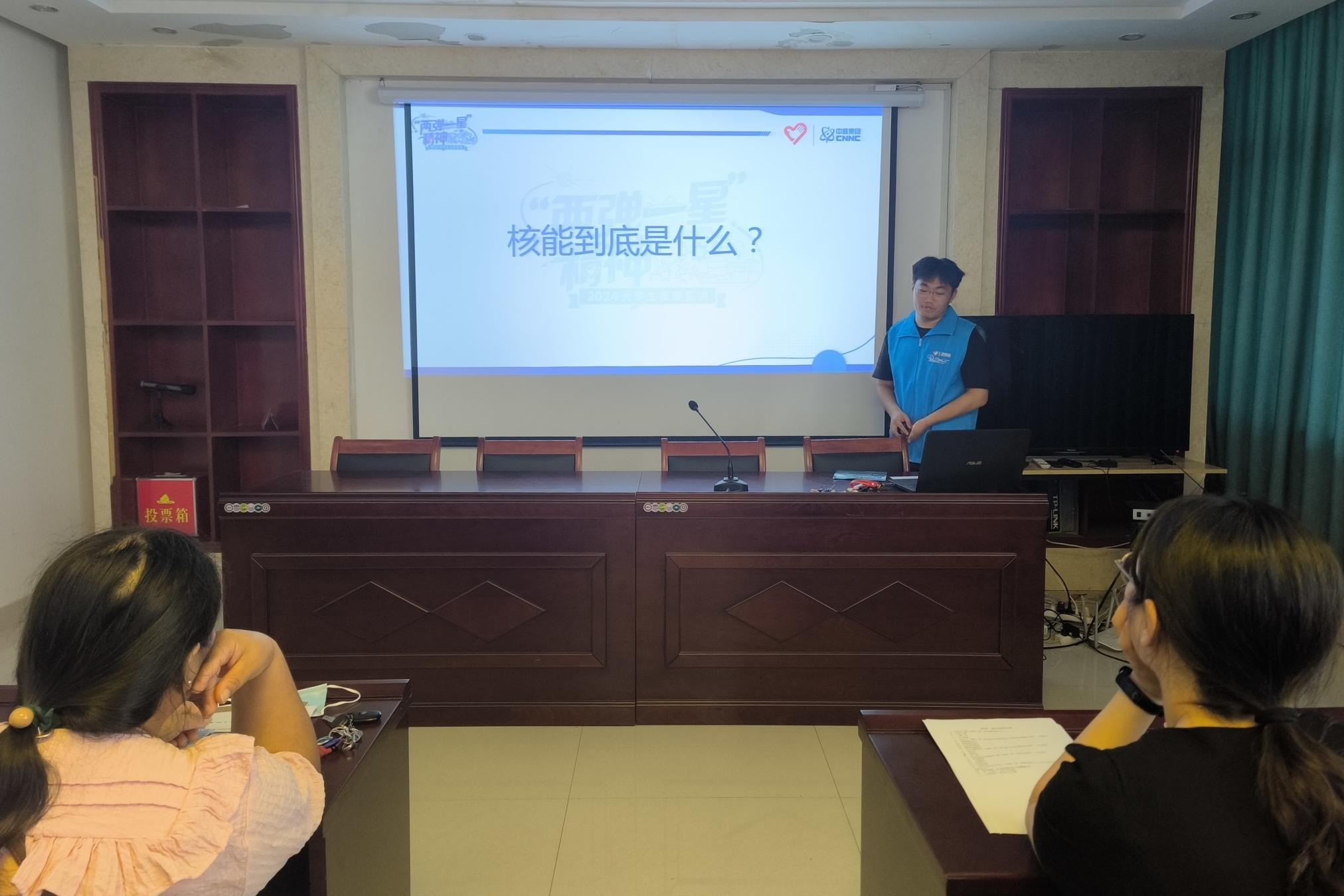 7月9日,物理与电子工程学院赴卧龙区武侯社区开展暑假“三下乡”社会实践活动。志愿者们借助图文和视频资料,向居民们介绍核能的发展历程以及我国“两弹一星”领域获得的成就,宣传“热爱祖国、无私奉献,自力更生、艰苦奋斗,大力协同、勇于登攀”的“两弹一星”精神,分发“两弹一星”精神宣传册,组织填写相关知识问卷。