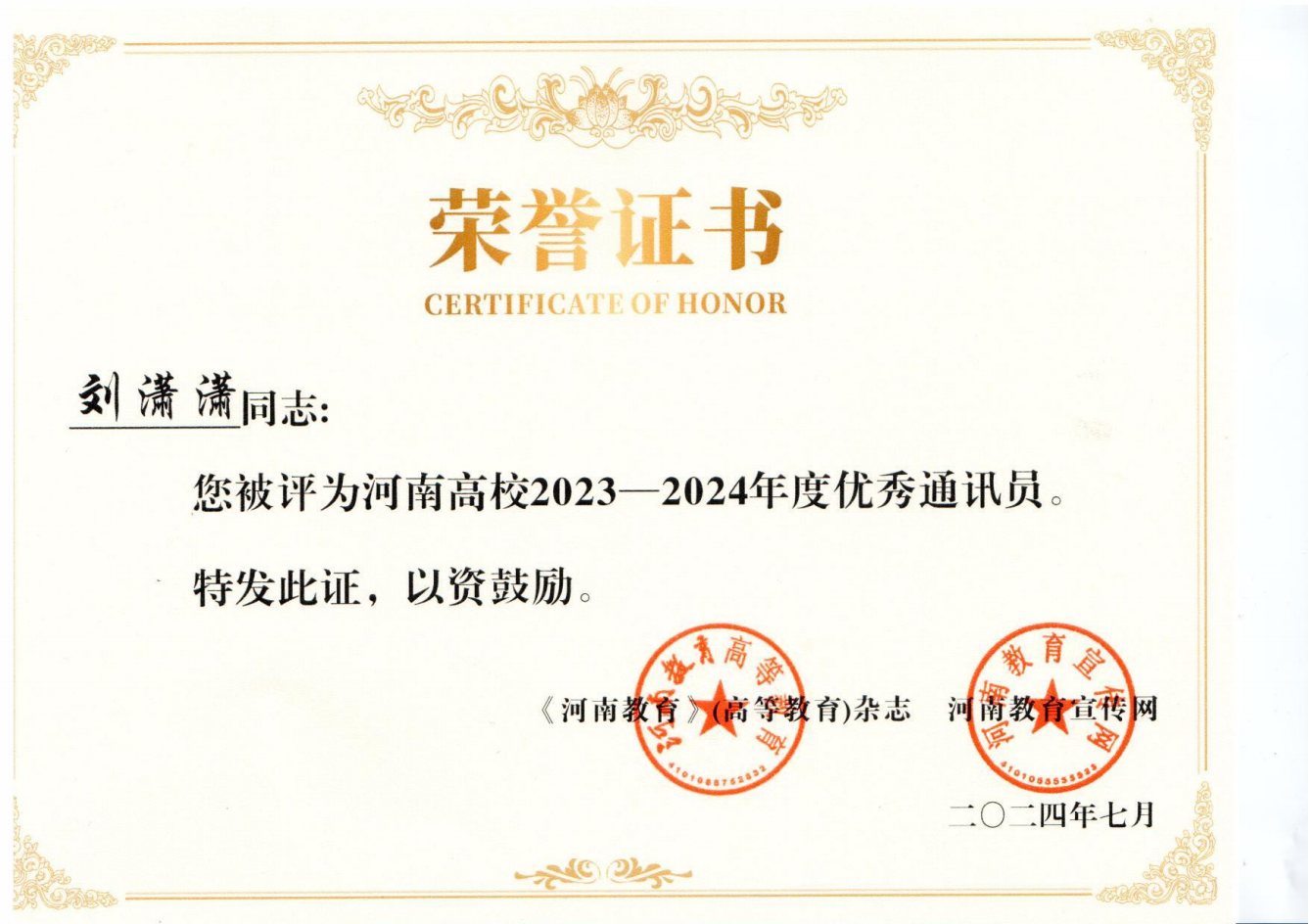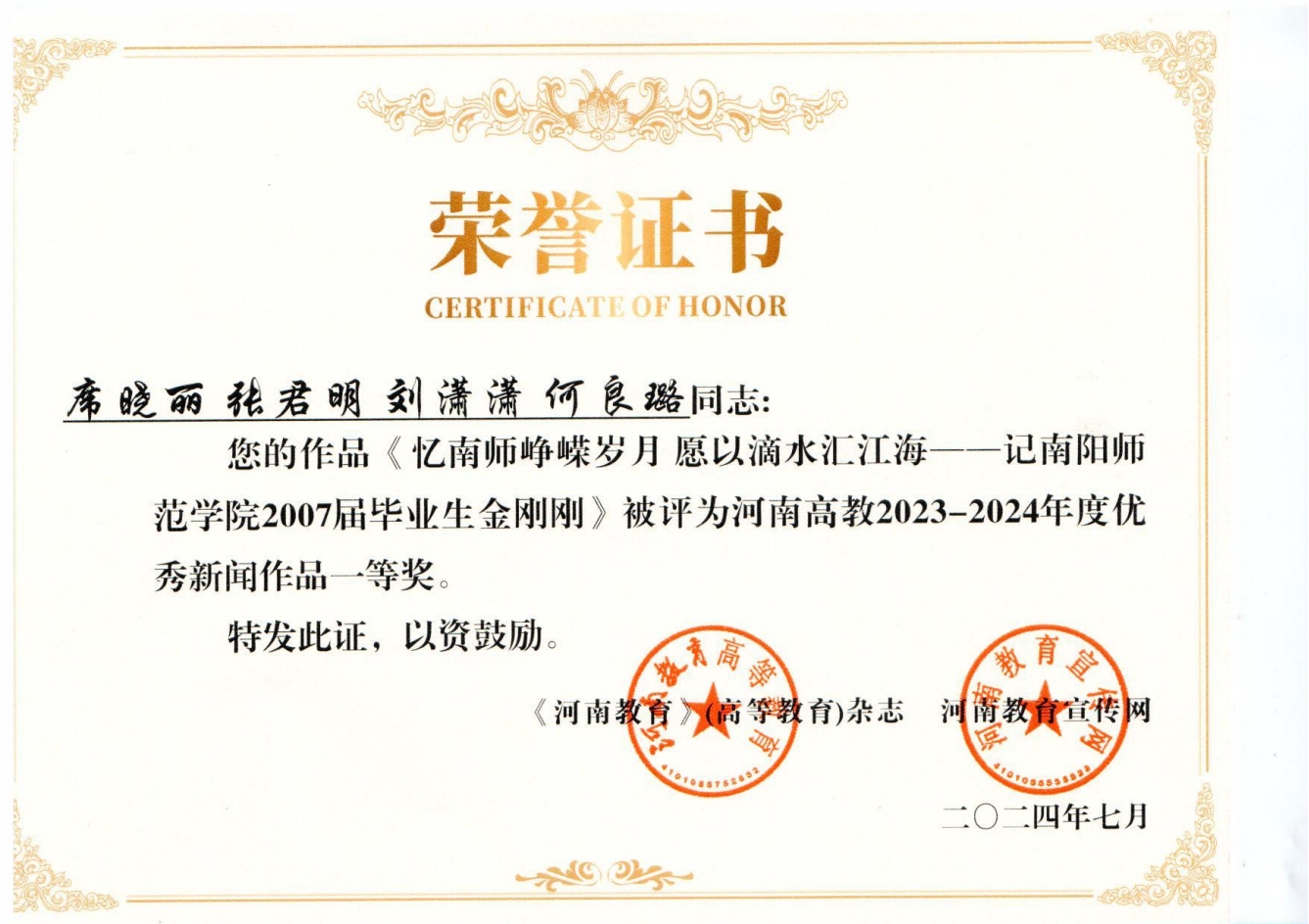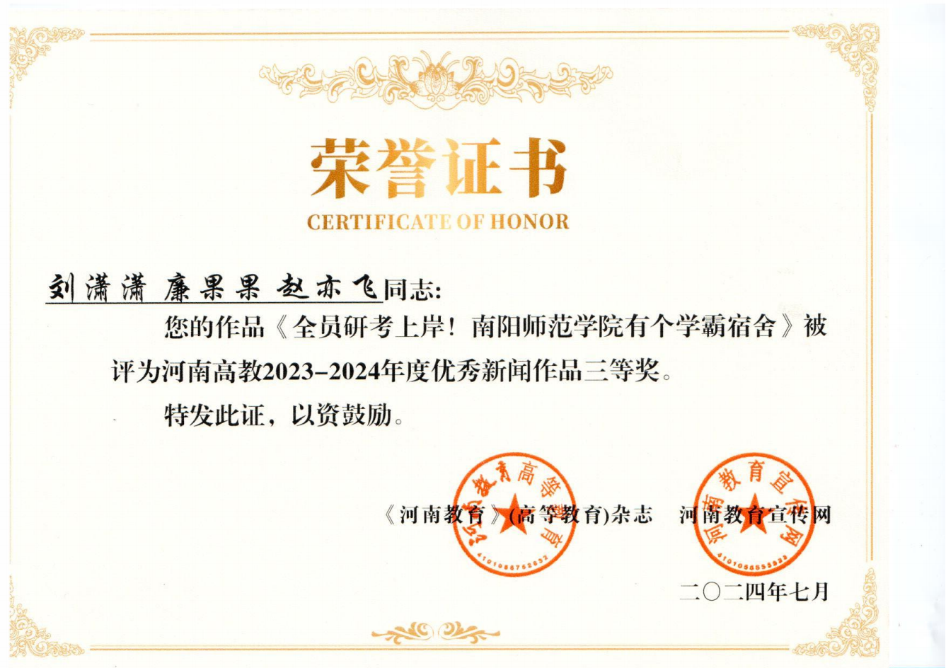 本网讯(通讯员 廉果果)近日,由河南省高等教育学会、河南教育报刊社主办的河南高校2023—2024年度宣传工作评选结果揭晓,经学校申报推荐、专家组集中评审等程序,天游官网荣获河南高校2022-2023年度宣传(通联)先进单位卓越奖,席晓丽、张君明、刘潇潇老师,何良璐同学的作品《忆南师峥嵘岁月 愿以滴水汇江海——记天游ty8线路1线路2检测中心2007届毕业生金刚刚》荣获优秀新闻作品一等奖,刘潇潇老师,廉果果、赵亦飞同学的作品《全员研考上岸!天游ty8线路1线路2检测中心有个学霸宿舍》荣获优秀新闻作品三等奖,刘潇潇老师获“优秀通讯员”称号。