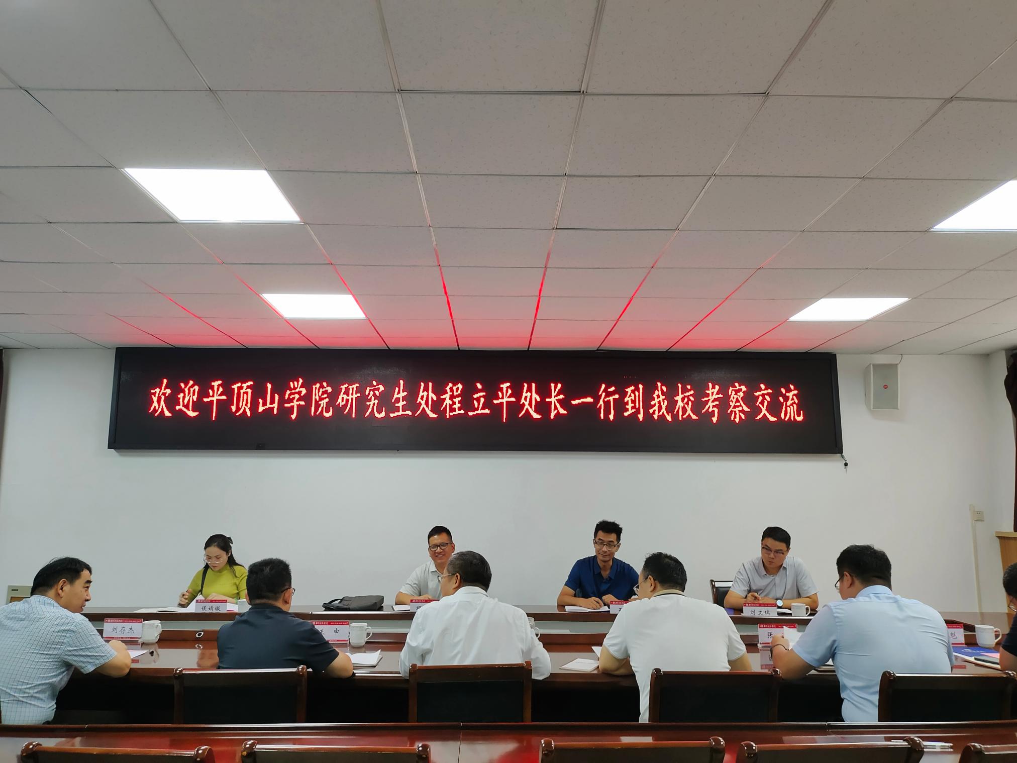本网讯(通讯员 刘存杰)9月19日上午,平顶山学院研究生处处长程立平一行4人来天游官网考察交流。座谈会在办公大楼一西会议室举行。研究生处负责同志及相关科室人员出席座谈会。