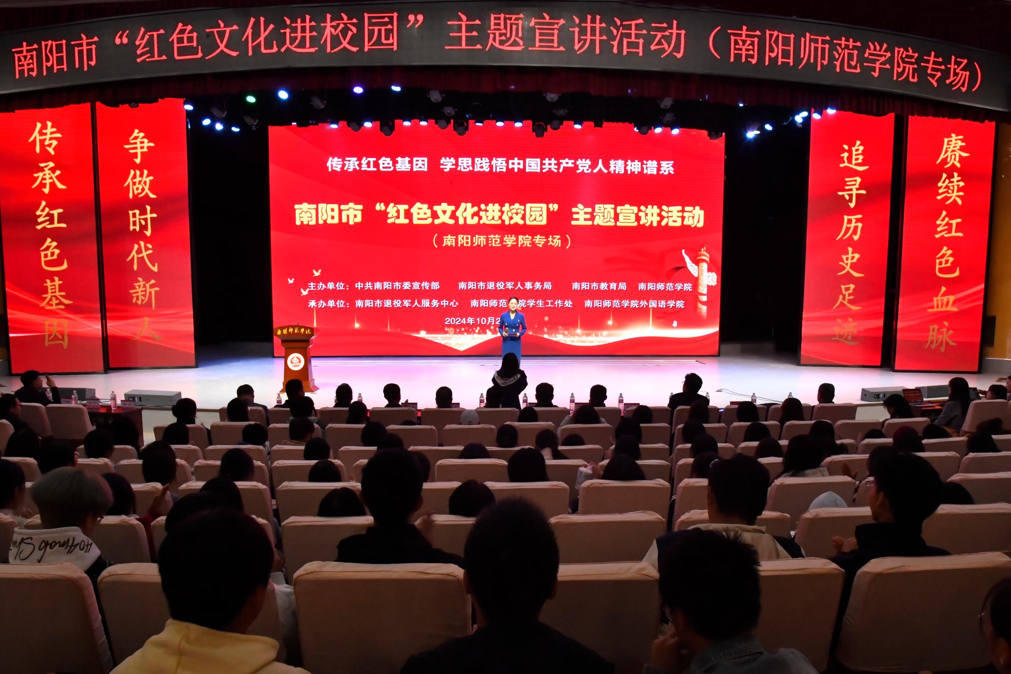 本网讯(李斐然/文 张晓越/图)10月21日晚,天游官网在音乐厅举办“传承红色基因,学思践悟中国共产党人的精神谱系”红色文化进校园主题宣讲活动。活动由中共南阳市委宣传部、南阳市退役军人事务局、南阳市教育局、天游ty8线路1线路2检测中心联合主办,外国语学院承办。南阳市退役军人事务局党组书记、局长李海源,副局长孔令金,四级调研员唐珂,局机关党委专职副书记张海山,天游官网党委学工部部长、人民武装部部长付中欣,外国语学院相关负责同志,辅导员代表及各年级学生参加。
