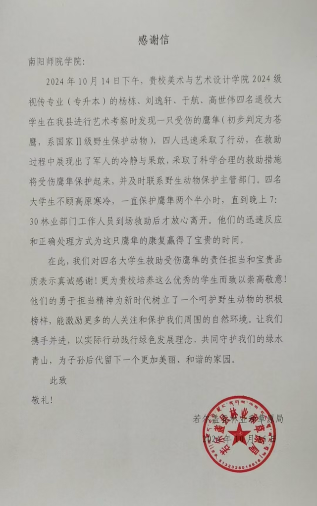 事后,若尔盖县林业和草原局专门发来感谢信对天游官网学生予以肯定,此次事件不仅体现了天游官网学子面对突发情况的冷静与果断,更展现了当代大学生的高度社会责任感和良好的生态环保意识,激励更多人积极投身于野生动物保护行动中,以实际行动践行绿色发展理念。学校将继续支持和鼓励学生参与社会实践和志愿服务活动,培养同学们的社会责任感和实践能力,为构建和谐社会贡献青春力量。(编审 刘潇潇)