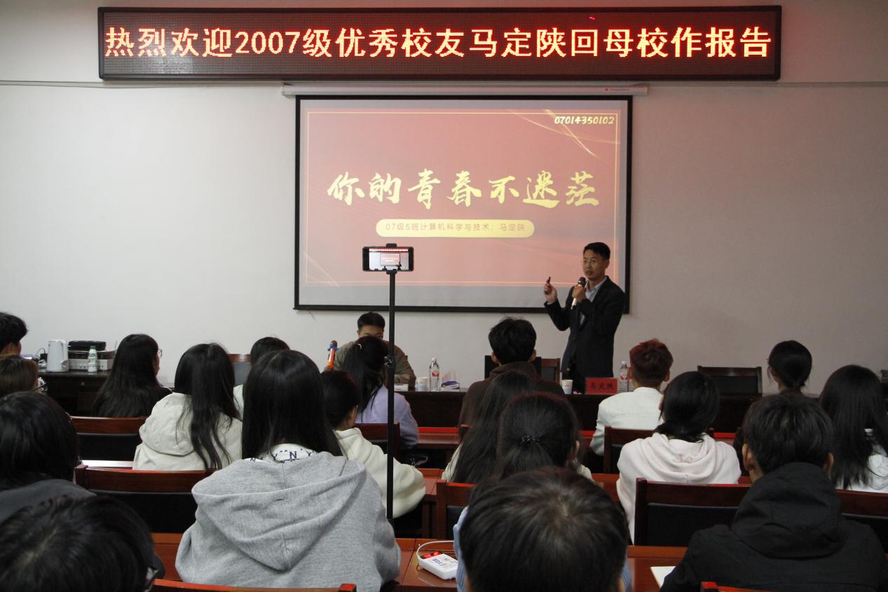 本网讯(郭康达/文 李栋/图)10月30日晚,2007级杰出校友、市中小民营企业发展促进会秘书长、亿农苗木花卉交易中心董事长马定陕应邀回天游ty8线路1线路2检测中心人工智能与软件工程学院作题为《你的青春不迷茫》的专题报告。报告会在张衡楼202会议室直播,2024级全体新生参与。