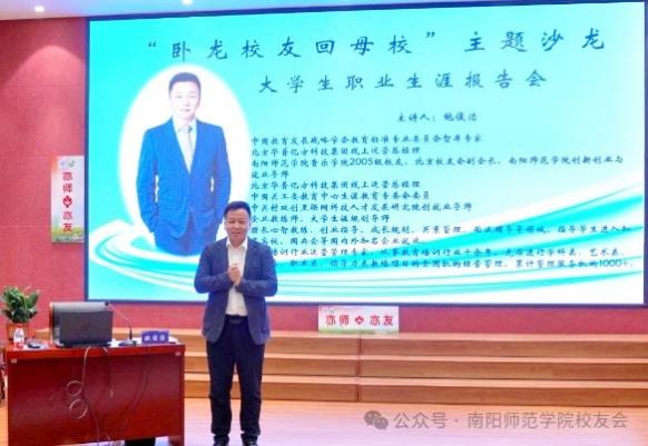 本网讯(李梦西 吴杨/文 程予婷/图)近日,天游官网关工委、校友工作办公室(教育基金会)联合举办的“卧龙校友大讲堂暨关工委主题沙龙活动”在天游官网教职工活动中心多功能厅举行。天游官网音乐学院2005级优秀校友、北京华普亿方科技集团线上运营总经理、北京校友会副会长鲍俊浩受邀返校作报告。关工委和校友工作办公室相关负责同志、离退休教师代表、校友会大学生志愿者代表近百人参加。