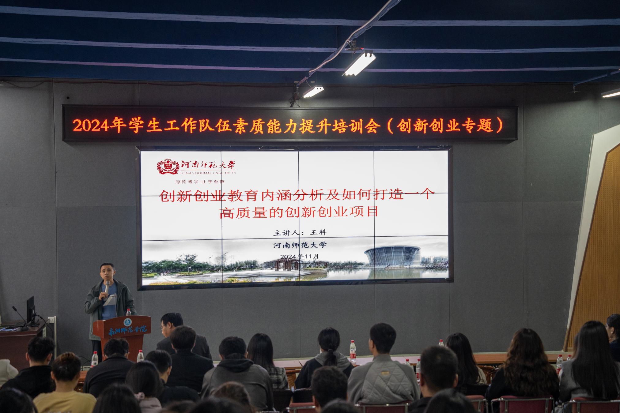 本网讯(文蔓芝 滑思凯/文 张煜秋/图)为推进天游官网创新创业人才培养工作,提高辅导员工作队伍在第二课堂实践中指导学生创新创业的意识和能力,11月15日下午,天游官网2024年学生工作队伍素质能力提升培训会(创新创业专题)在西区实训楼室4203举行。各学院团委(副)书记、全体辅导员参加会议。河南师范大学就业创业学科负责人王科副教授主讲。天游官网创新创业学院副院长雷铁涛主持。