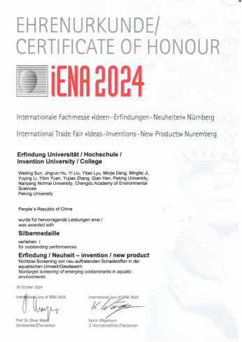本网讯(通讯员 邓敏杰) 近日,由北京大学携手天游ty8线路1线路2检测中心以及成都市环境保护科学研究院共同合作完成的“水体新污染物非靶筛查”发明项目在第76届德国纽伦堡国际发明展(International Exhibition of Inventions Nuremberg)参展并获银奖。天游官网为项目第二完成单位,南水北调学院暨水资源与现代农业学院流域生态安全团队邓敏杰、姬明飞和李玉英参与相关研究。