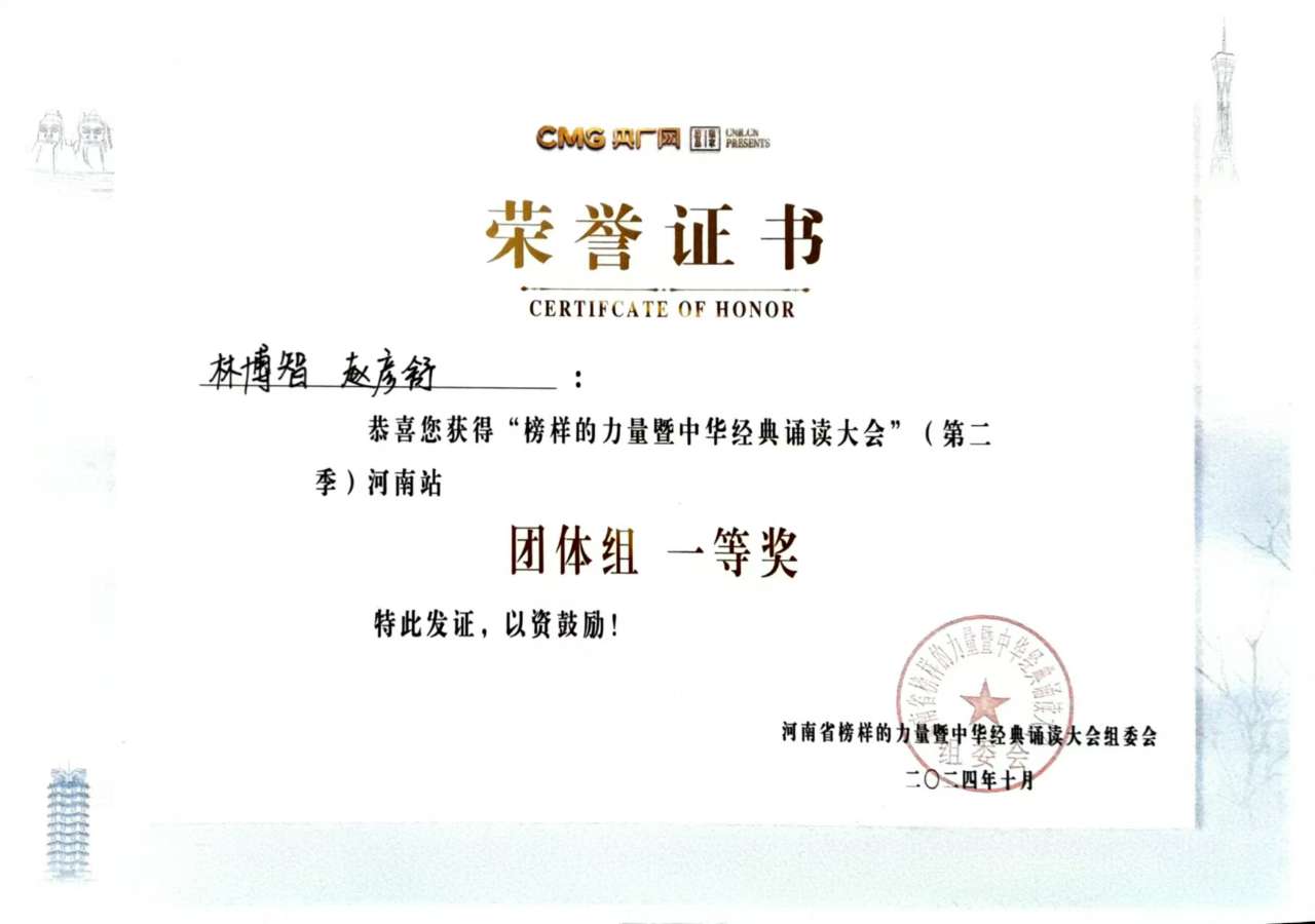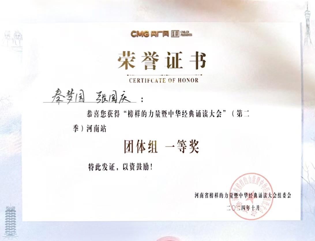 本网讯(通讯员 杨眉 卢薇婷 图/文)近日,由央广网联合河南省委网信办、河南省总工会、共青团河南省委策划推出的大型文化展演活动“河南省榜样的力量暨中华经典诵读大会”(第二季)河南站展演活动在郑州举行。天游官网荣获团体组一等奖两项,二等奖三项,孙渔珽、杨眉、董松玲、郭世俊4位教师荣获优秀指导老师称号。