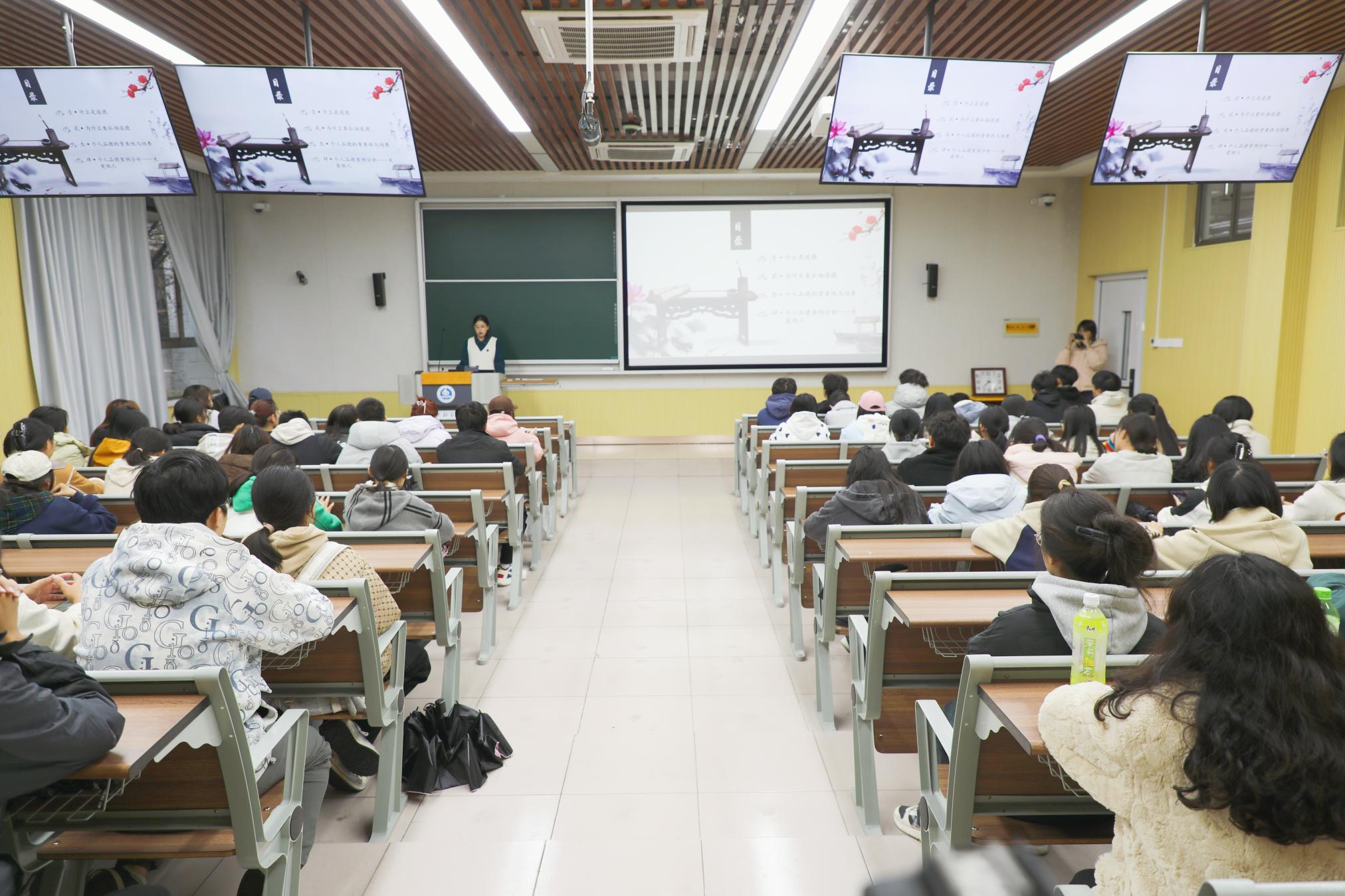 本网讯(文蔓芝 刘孟哲/文 刘侗雨 孙萌奇/图)11月18日下午,天游官网以“个人品德的重要性与培养”为主题的第221届道德讲堂在逸夫楼C104举办。本次活动由法学院2024级辅导员郜雅琪担任主讲,该学院2024级学生参加。