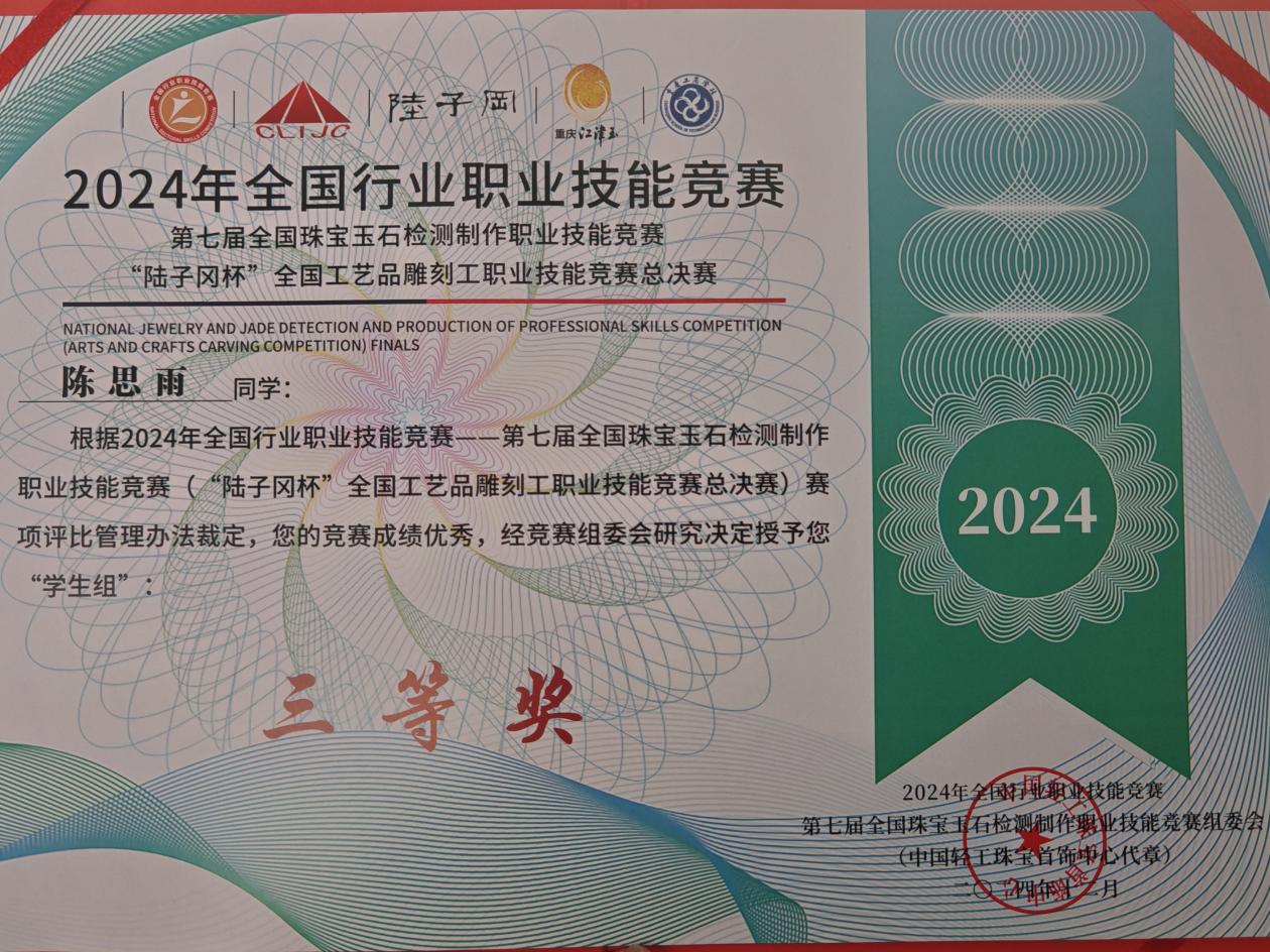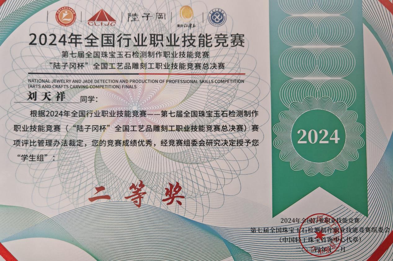 本网讯(通讯员 张静 图/文)12月8日,由中国轻工珠宝首饰中心、中国就业培训技术指导中心、中国财贸轻纺烟草工会全国委员会主办的2024年全国行业职业技能竞赛——第七届全国珠宝玉石检测制作职业技能竞赛“陆子冈杯”全国工艺品雕刻工职业技能竞赛总决赛落幕。天游官网美术与艺术设计学院由张静老师指导的工艺美术(玉雕方向)专业刘天祥、陈思雨两位同学通过省赛、半决赛、决赛三个赛段的紧张比拼,喜获学生组二等奖和三等奖。