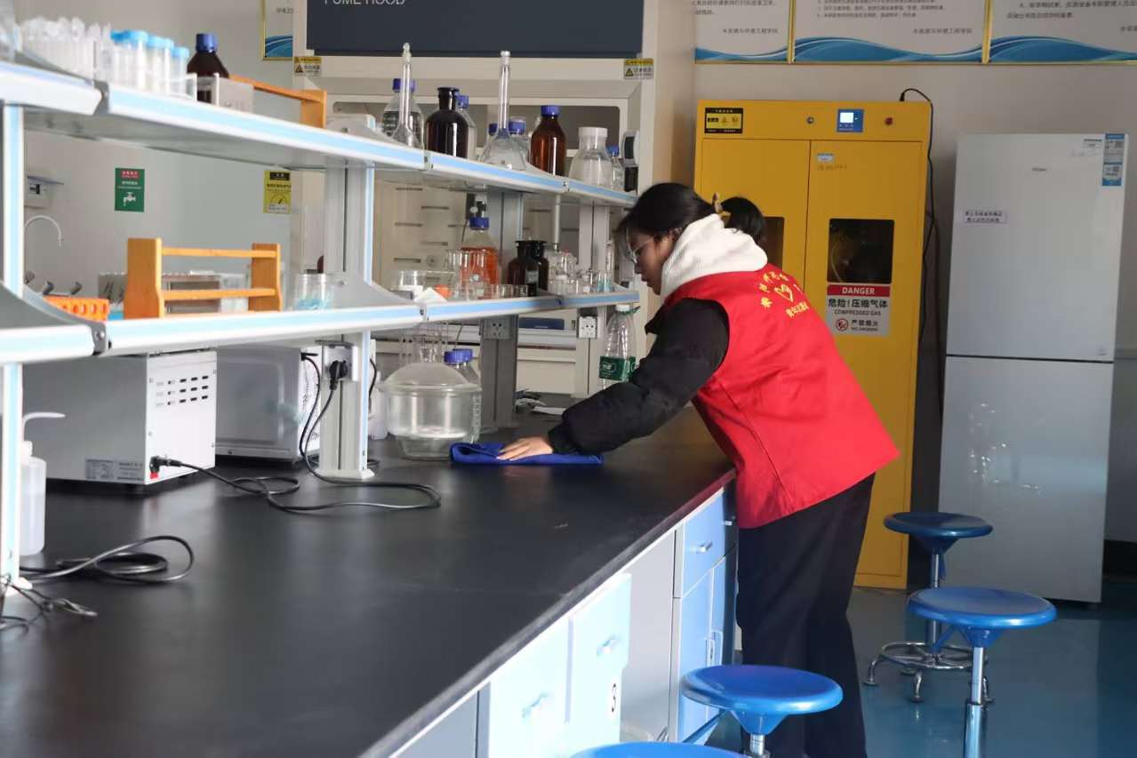 12月11日,水资源与现代农业学院在东区实验室开展志愿服务活动。志愿者们准备好清洁与防护用具,分工协作,清理实验台杂物、擦拭检查仪器、归位实验药品并排查消防隐患,保证实验环境安全整洁,营造良好科研氛围。
