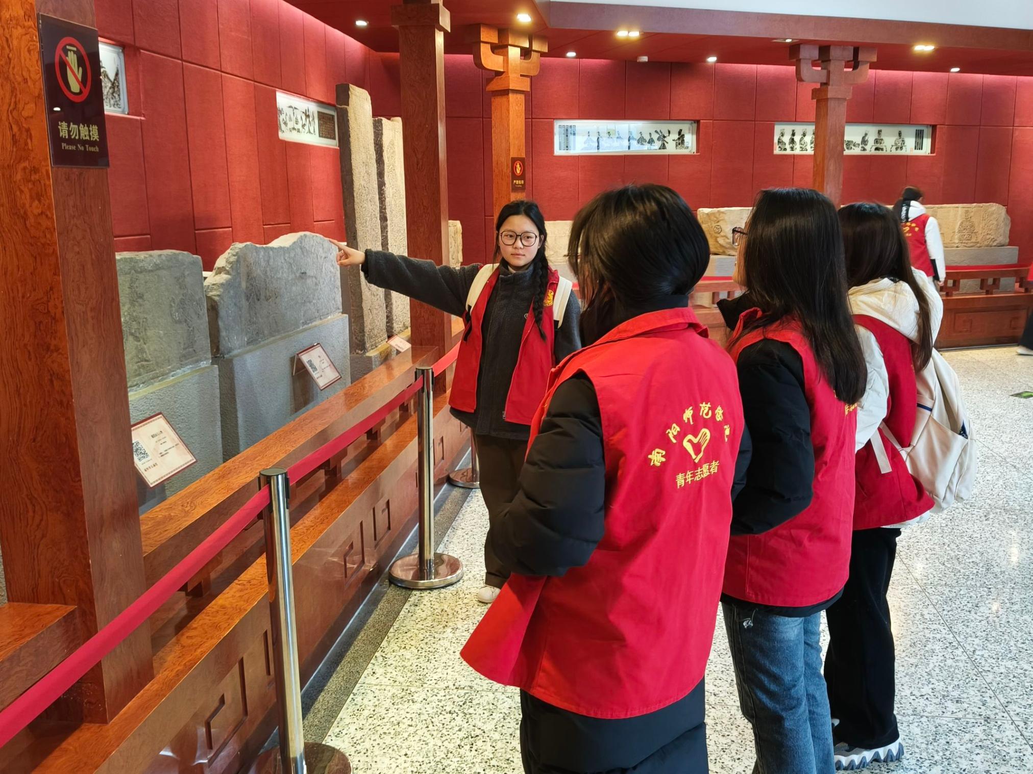 12月15日,化学与制药工程学院赴南阳市汉画馆开展志愿服务活动。志愿者们为游客发放参观指南,介绍馆内布局与重点展品区域,帮助游客规划参观路线,为游客提供详细讲解,同时维持展厅的环境卫生和参观秩序,提醒观众文明参观。(编审 刘潇潇)