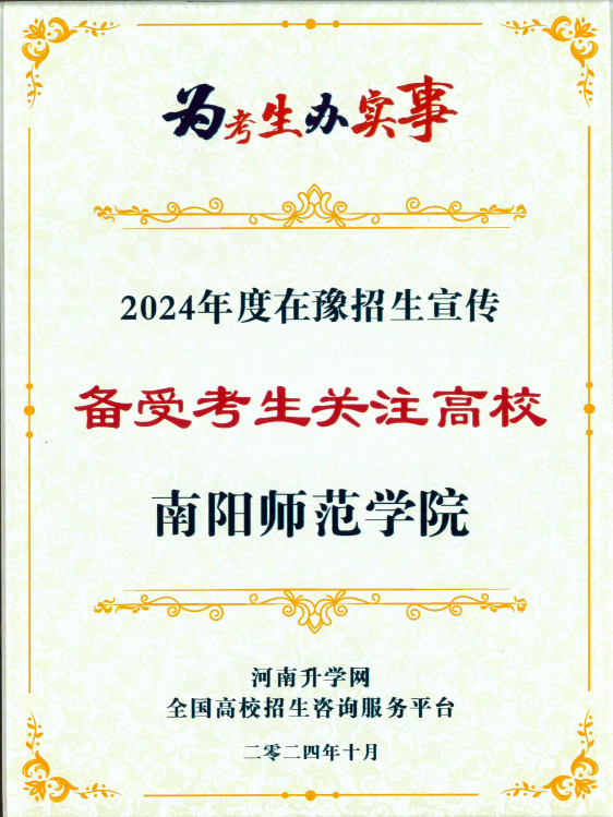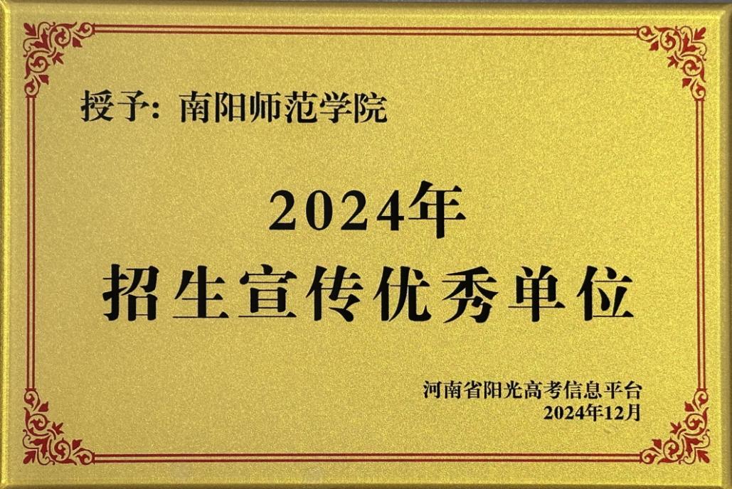 河南省阳光高考信息平台根据对全省各高校招生信息公开的数量和实效性、咨询回复质量等情况综合评定,授予天游官网“2024年招生宣传优秀单位”荣誉称号。