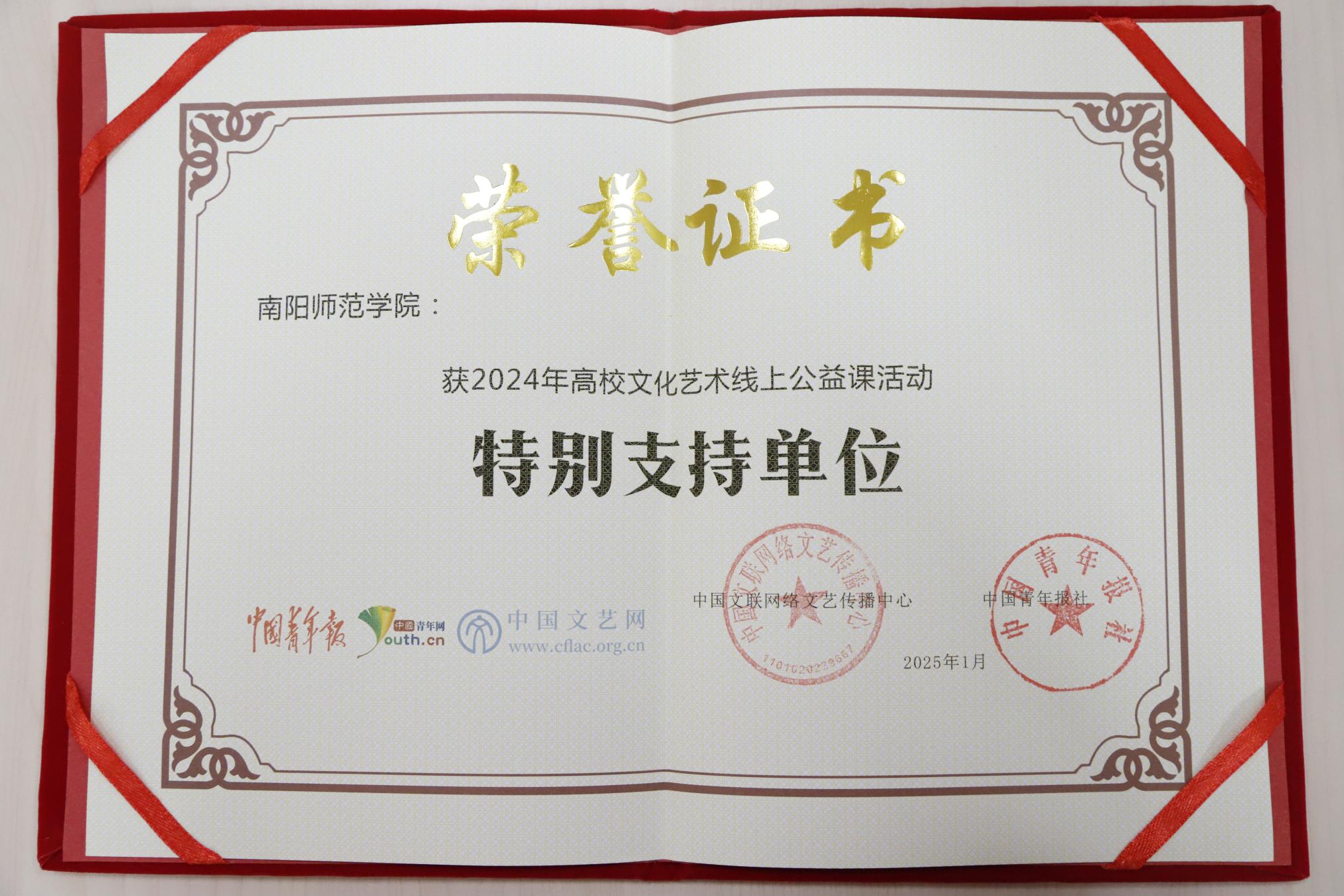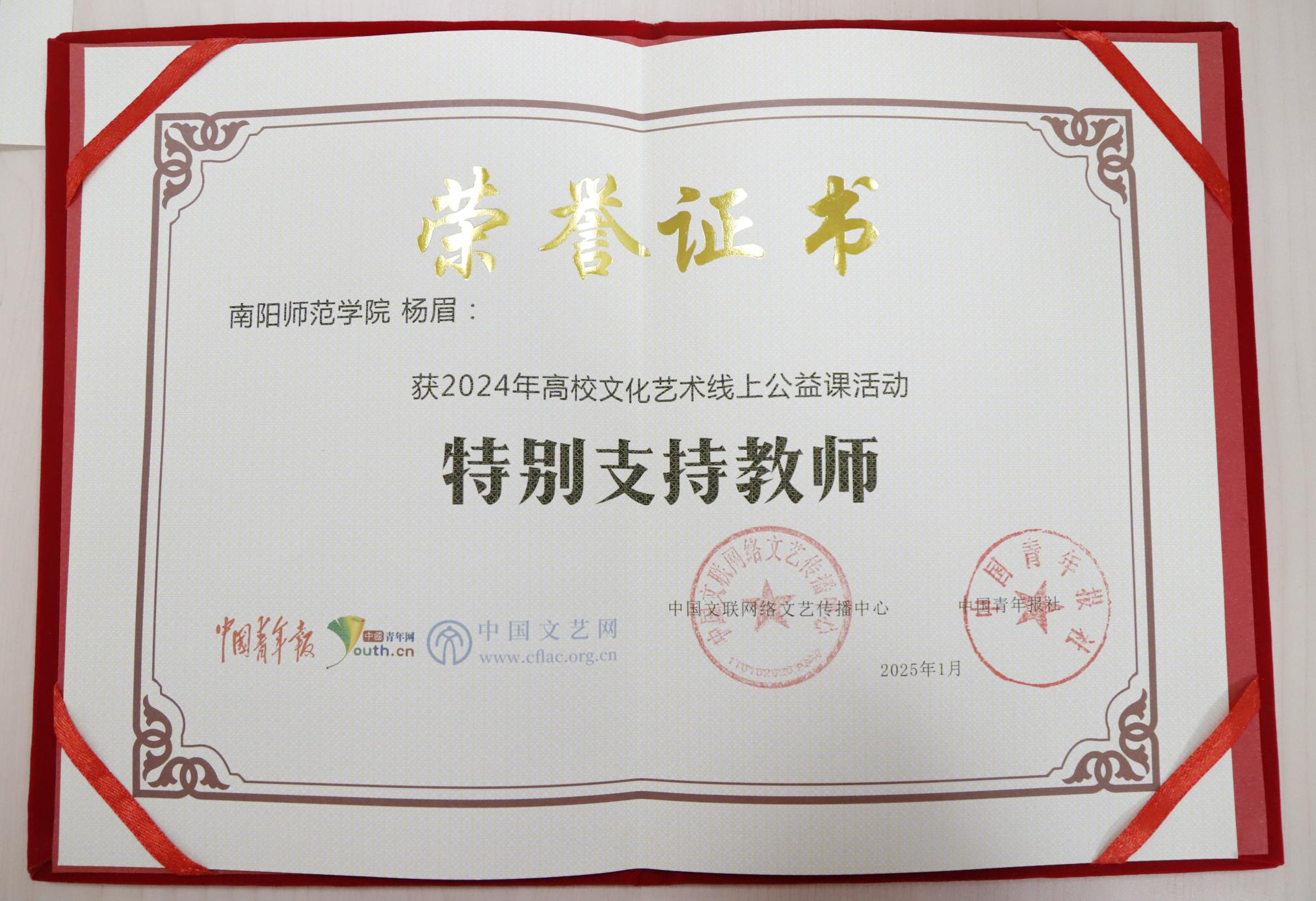 本网讯(通讯员 杨眉 刘馥涵)近日,由中国文联网络文艺传播中心、《中国青年报》举办的2024年高校线上公益课活动结果公布。天游官网获评特别支持单位,杨眉老师荣获特别支持教师荣誉称号。