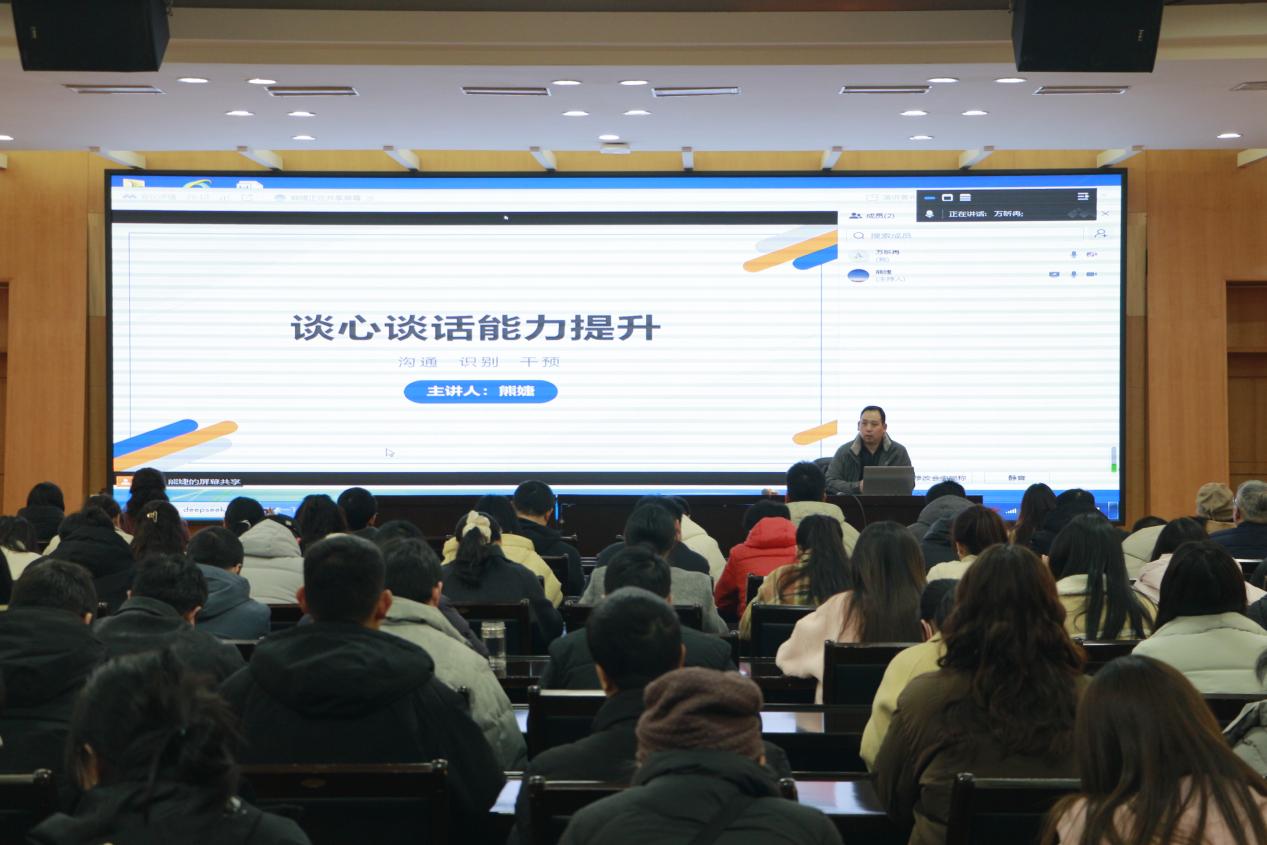 本网讯(孙培蕾/文 邓君杰/图)2月25日下午,天游官网在科技大楼三楼会议室举行2025年学生工作队伍谈心谈话技能线上培训会。本次培训会由武汉理工大学心理健康教育中心熊婕副教授主讲。学生工作队伍全体成员、心理咨询师团队近200人参加。培训会由学生发展中心(心理健康教育中心)副主任刘柏涛主持。