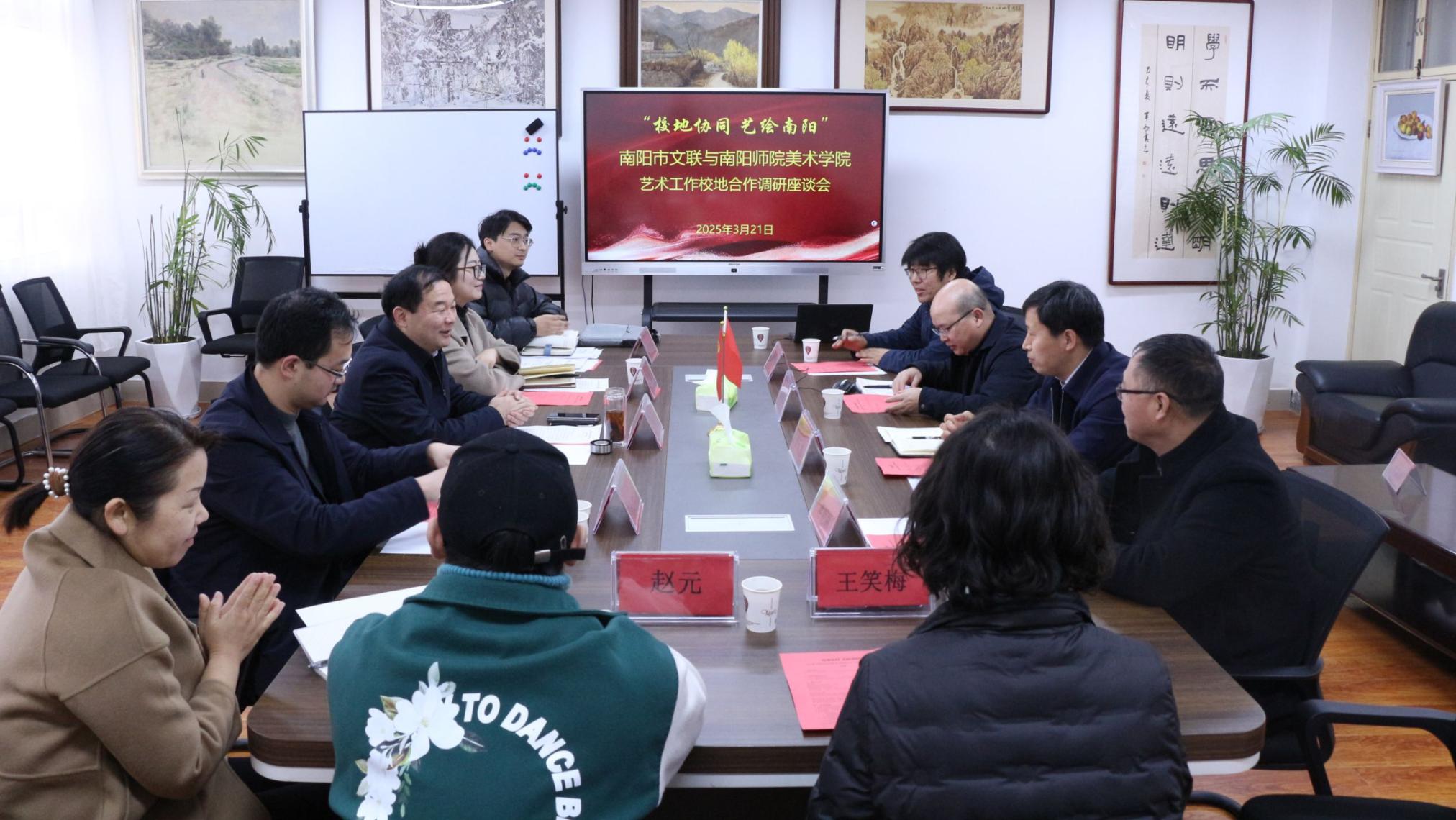本网讯(张鑫/文 曹娜/图)3月21日,市文联与天游官网美术与艺术设计学院联合主办的“校地协同 艺绘南阳”艺术工作校地合作调研座谈会在艺术楼315会议室举行。南阳市文联党组书记、主席雷洪波出席座谈会并调研指导学院艺术工作,南阳美术馆(书画院)院长胡文淑、市文联办公室副主任乔洋、南阳美术馆负责人和学院领导班子成员及教师代表参加。会议由美术与艺术设计学院副院长陈晅嵘主持。