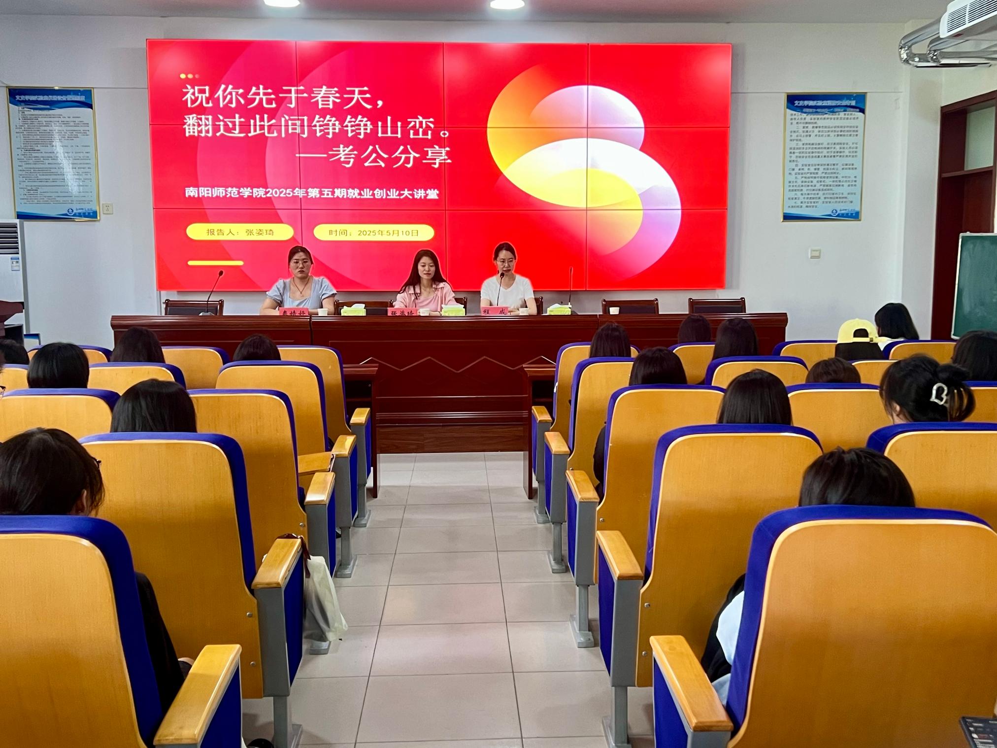 本网讯(秦婧妤/文 李晨星/图)为助力同学们深入了解考公路径,提升就业竞争力,5月10日下午,由创新创业学院主办、文学院承办的2025年第五期就业创业大讲堂在逸夫教学楼S305教室功举办。本次会议以“公务员考试经验分享”为主题,文学院2020级毕业生张姿琦作经验交流分享,文学院2022级学生代表参加。